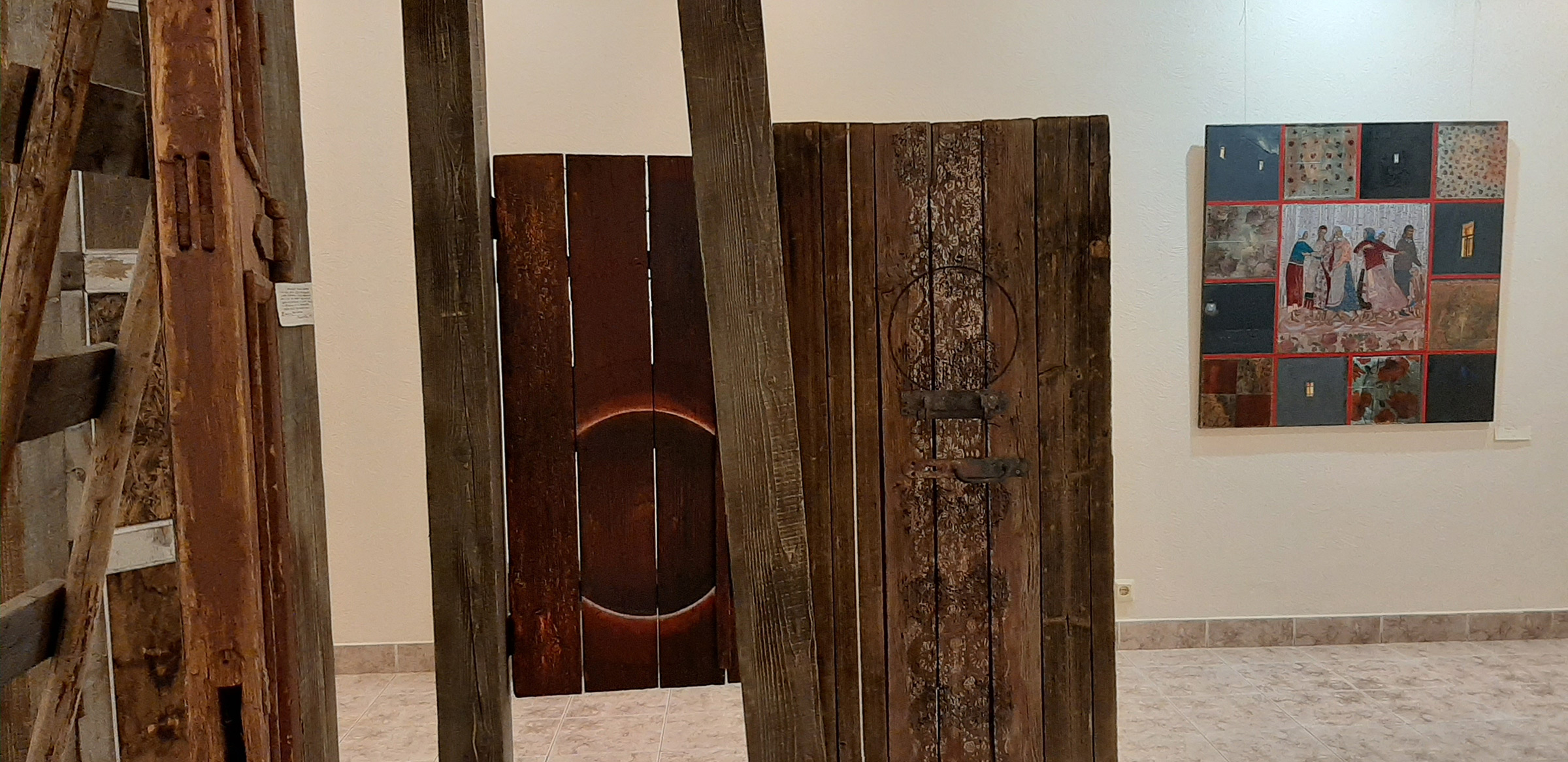 Двери в заголовке, — не только метафорические, обозначающие постепенный выход из изоляции, но и абсолютно материальные, установленные в центре выставочного зала в виде небольшой инсталляции. Как любая дорога, путь к этой выставке начинался с двери — старой, деревянной, деревенской, болтающейся без особого дела под открытым небом во дворе дачи художника Максима Нурулина. Какой стене, какой постройке принадлежала эта дверь, уже неизвестно. В момент знакомства с ней директора галереи «Марис-арт» Татьяны Пермяковой от постройки осталась лишь эта дверь да косяк, который её держал.