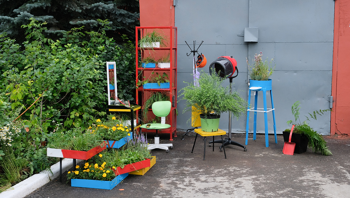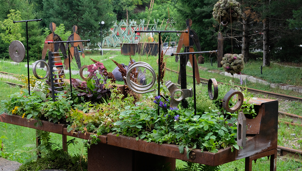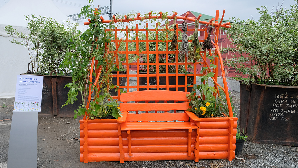 Дикоросы заполонили всё пространство «Завода Шпагина», отважно взбираясь на супрематических «рабочих» и покоряя дрезину, стоящую на помосте, — ведь именно так поступают настоящие рудеральные растения в реальности: они первыми заполоняют бывшие индустриальные пространства. Здесь же им помогли дизайнеры. Использование «сорняков» в фито- и ландшафтном дизайне — одна из главных тем этой многосоставной выставки. Непривычные материалы дали дизайнерам возможность выступить с оригинальными высказываниями — взять хотя бы инсталляции «Музыка полей» Татьяны Корюкиной и Елены Мушковой, «В Уральских горах моё сердце» Ирины Петровой, Анны Васильевой и Виктории Черновой (подставки для ампельных растений в виде остроконечных гор, а между ними — «река»-скамейка), «Гармония С» Алексея Дубровина, «Причёска в стиле ретро» Александры Шарафеевой и Виталия Запивалова, остроумно обыгрывающая понятие «зарасти» в применении к шевелюрам, — но авторская часть экспозиции, наверное, всё же не главная.