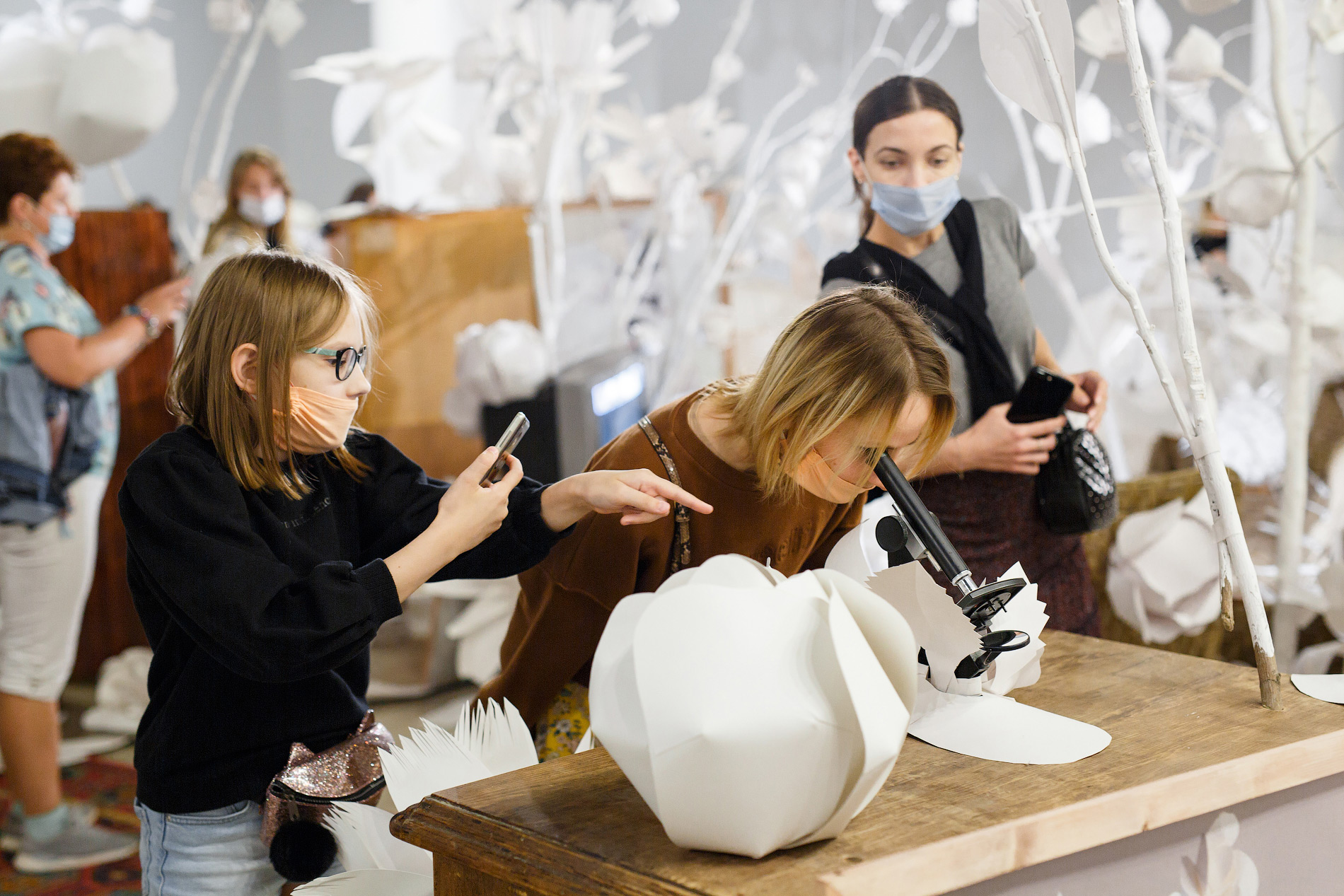Поначалу кажется, что инсталляцию нужно обходить снаружи, чтобы ненароком не попортить хрупкую конструкцию, и многие посетители музея именно так и делают. Однако на самом деле нужно активно исследовать этот мир и находить в нём сюрпризы от Венеры Казаровой. На полочках шкафов, под лупами и микроскопами — кадры всего того, о чём идёт речь на первом этаже: взрывы, руины… Пусть совсем маленькие, но страхи пролезают даже в дом детства, поросший хрупкими цветами воспоминаний.