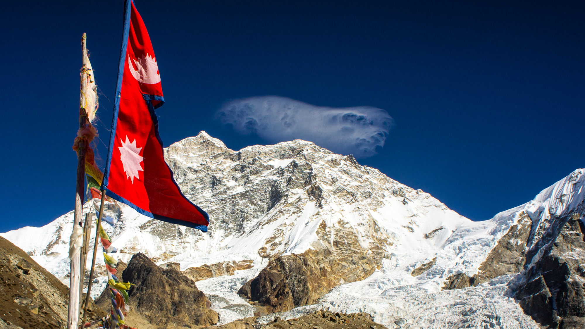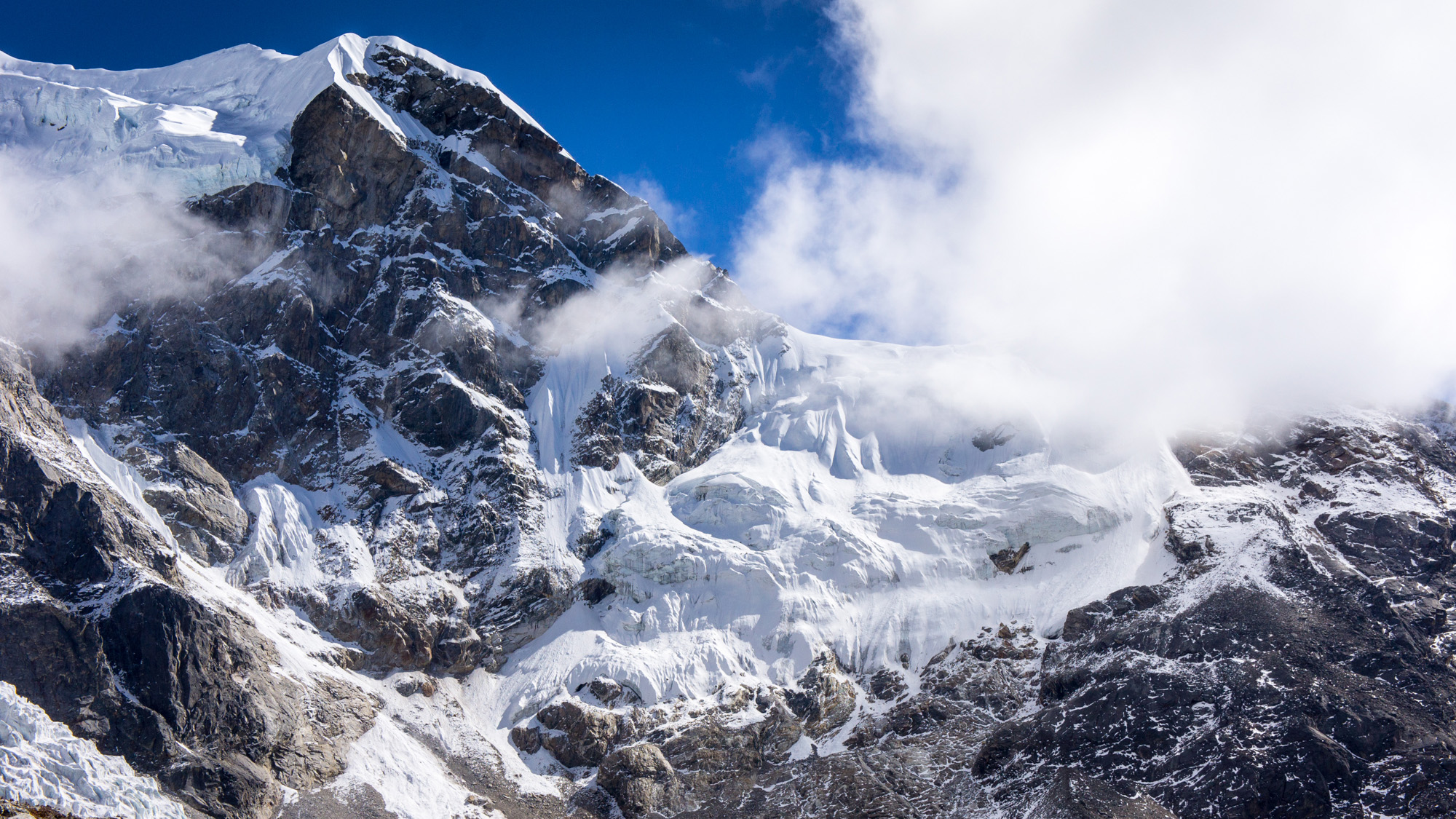 Почему лагерь Швейцарский и что тут было нужно швейцарцам, выяснить не удалось. Это неровная площадка на высоте 5150 метров с потрёпанным баннером нацпарка и гирляндами молитвенных флажков. Место примечательно тем, что с него одновременно можно увидеть четыре восьмитысячника: Эверест, Лхоцзе, Лхоцзе Шар и Макалу. Долина ледника уходит в северо-западном направлении, где за несколькими пиками пониже возвышается огромный массив высочайшей вершины мира. Эверест выглядит отсюда не очень убедительно, видна белоснежная Северная стена, но вершины Лхоцзе кажутся выше. Даже в абсолютно ясную погоду вокруг Джомолунгмы то и дело сгущаются облака, укрывающие её от взоров. Пока мы любовались окрестностями, мимо Швейцарского лагеря прошла большая группа носильщиков, нагруженных палатками, кухонной утварью и даже походной мебелью. Они сопровождали туристов, следующих из Солукхумбу в район Канченджанги.