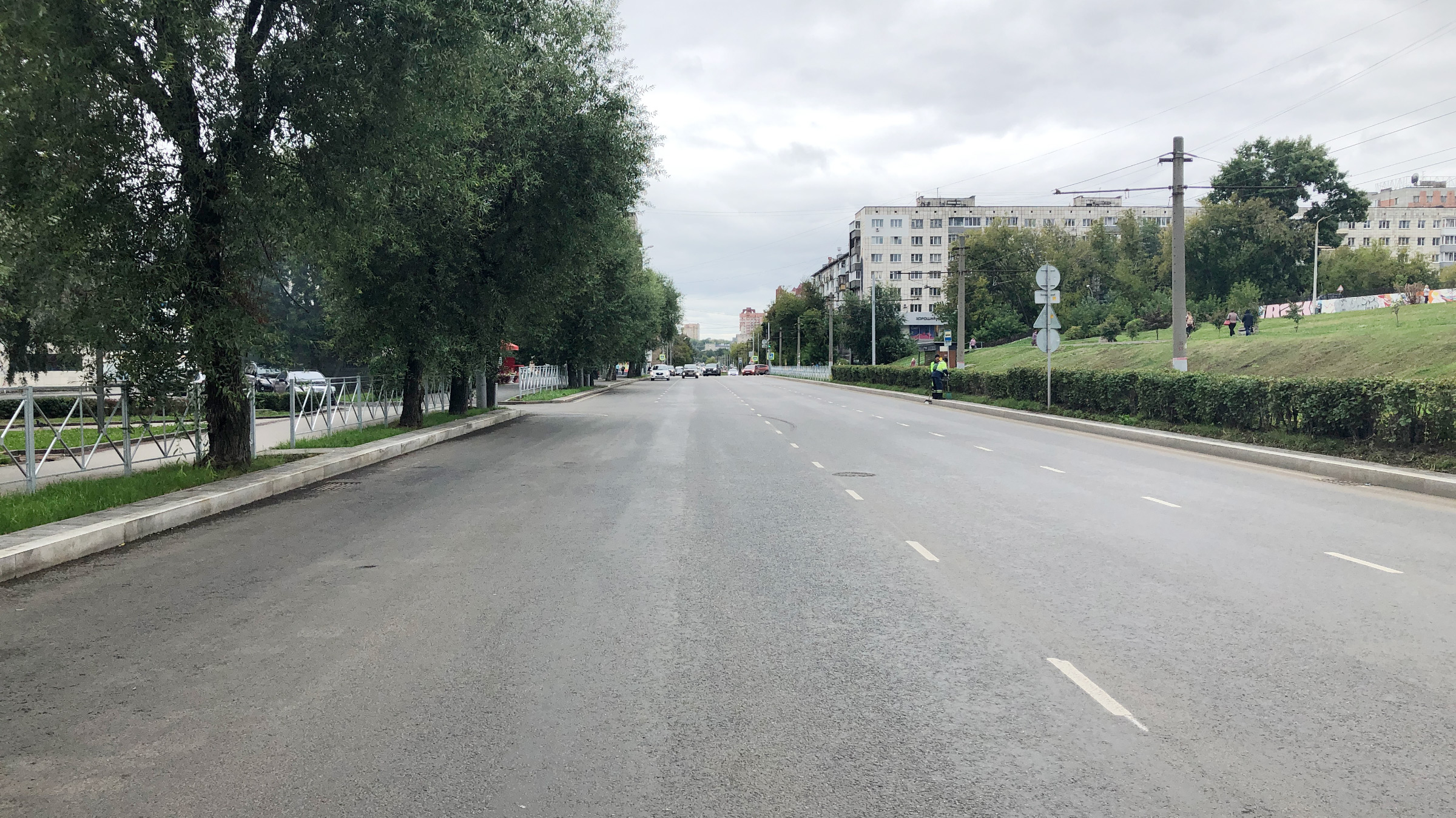 Здесь ремонт также проводили комплексно. Компания-подрядчик «СК Атриум» не только обновила дорожное полотно, но и заменила бордюрный камень, ограждения, тротуарную плитку на трамвайных платформах, отремонтировала верхние строения канализационных колодцев, засеяла газоны.