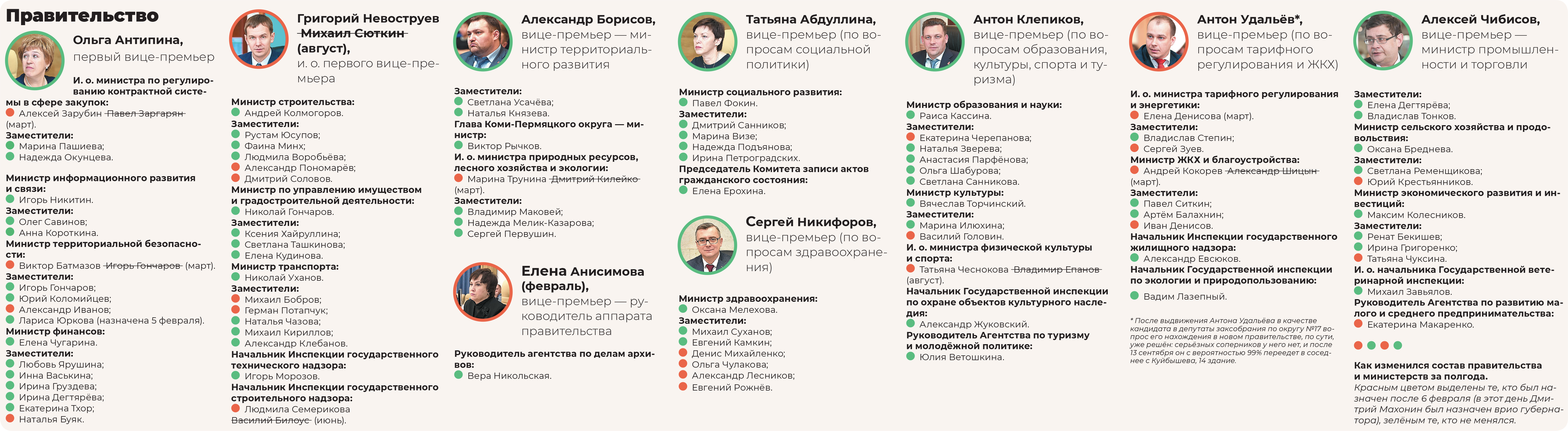 Одним из ключевых кадровых решений, принятых в августе, стало назначение бывшего первого зампреда Государственного комитета Республики Башкортостан по строительству и архитектуре Григория Невоструева вице-премьером краевого правительства. В Пермском крае он будет отвечать, по сути, за те же направления. Назначение человека со стороны увеличивает шансы действующего главы минстроя Андрея Колмогорова сохранить портфель. «Невоструев пока ничего не понимает, без Колмогорова ему не обойтись, — рассказывает один из источников. — Убрать Колмогорова — это вне логики. Кроме того, у Колмогорова и Махонина выстроилась нормальная система коммуникации, после того как он, по сути, напрямую руководил блоком с уходом Михаила Сюткина». Отметим, что за год с момента назначения бывшего главы УКСа Андрея Колмогорова министром (в конце сентября 2019 года) сменились все заместители, кроме Фаины Минх.