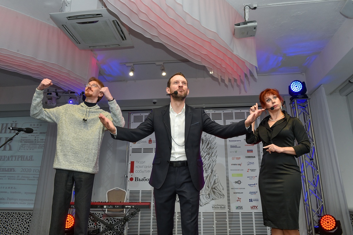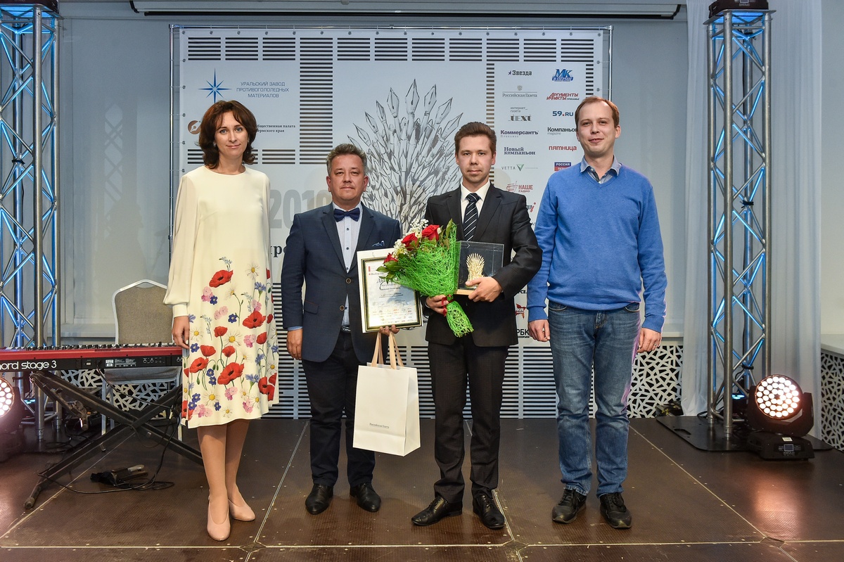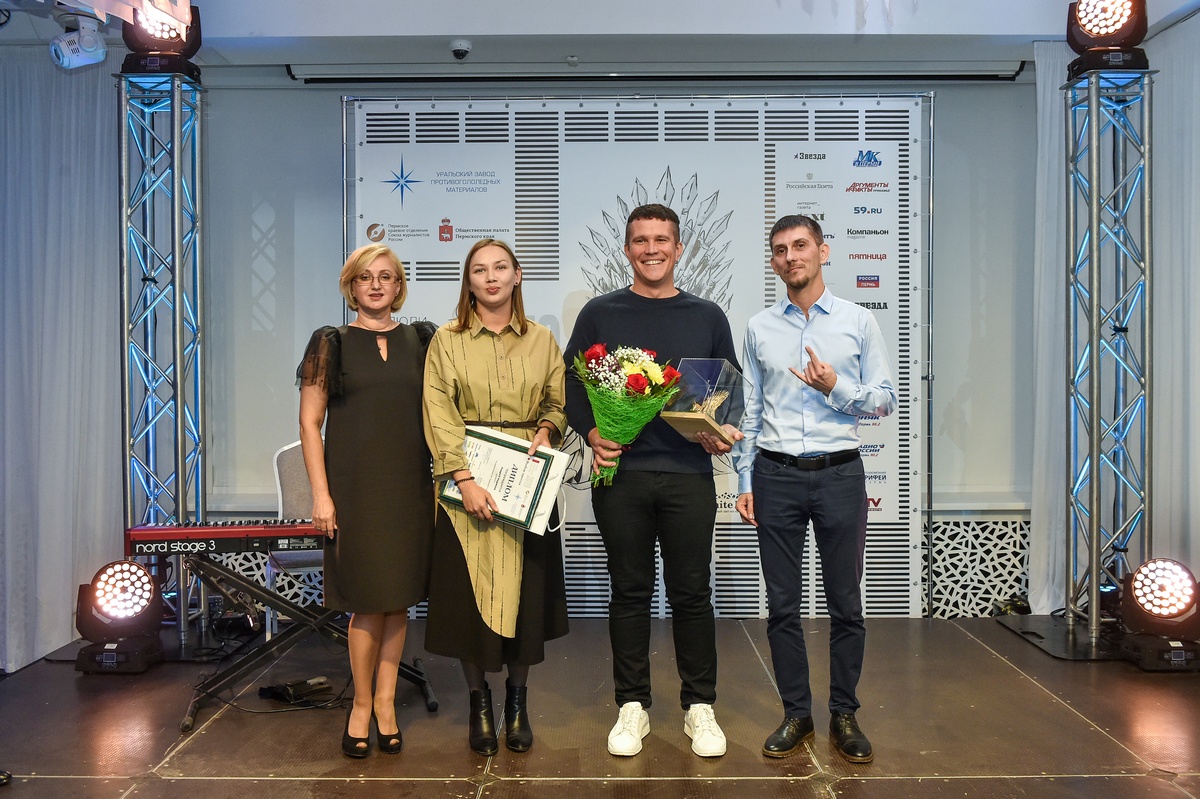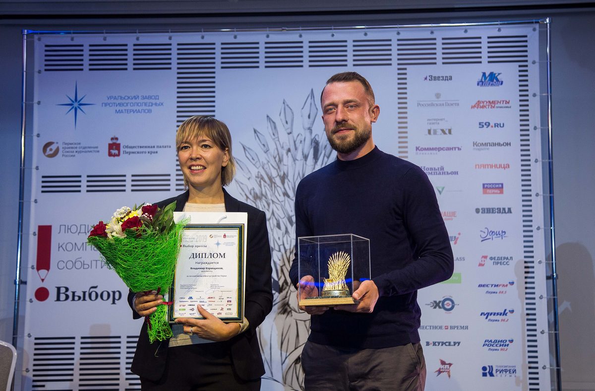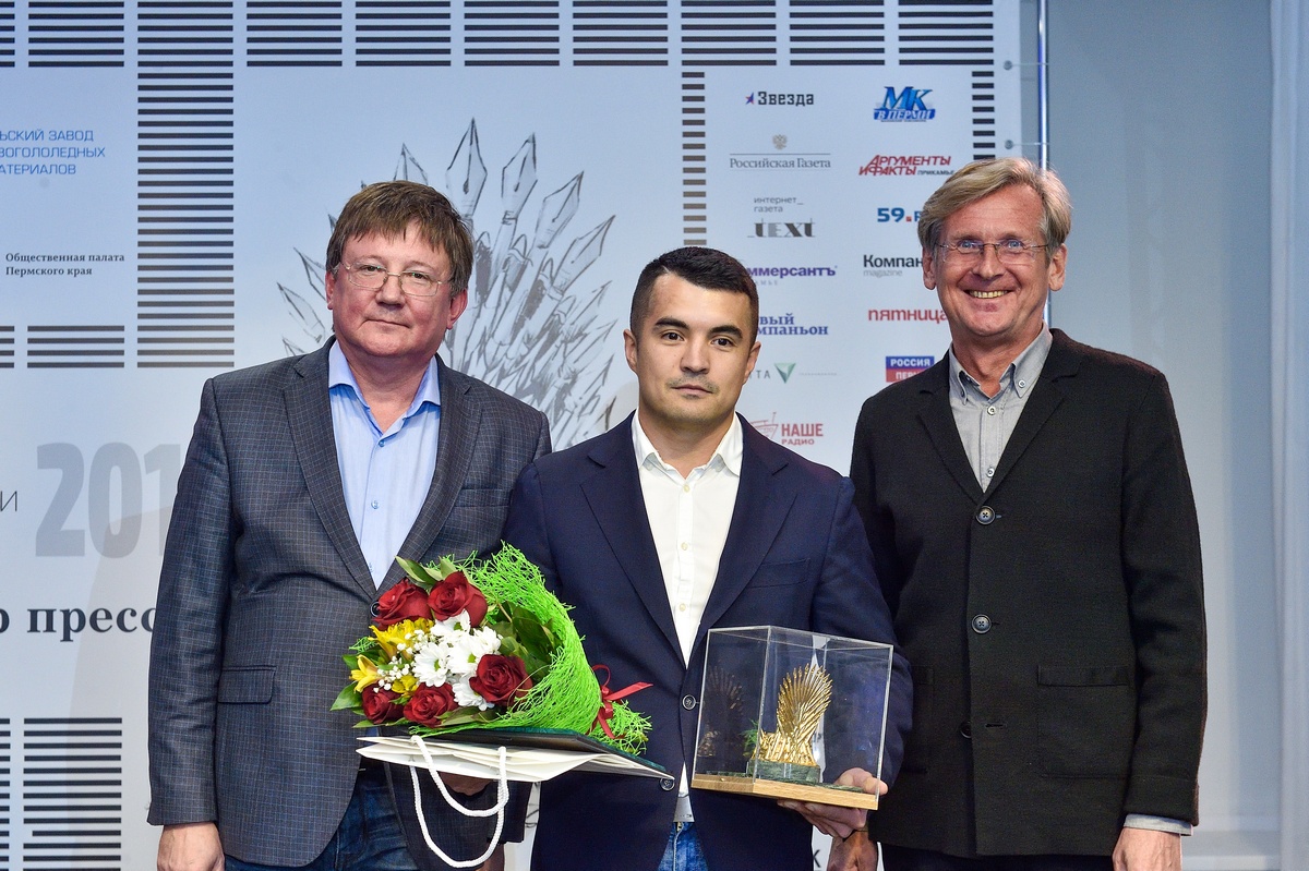 Главный редактор портала «ПроПермь» Владислав Аскариди, главный редактор портала 59.ru Екатерина Вохмянина и генеральный директор «Нашего радио» Наталья Пуртова вручили ему премию «за виртуозный PR Пермского края».