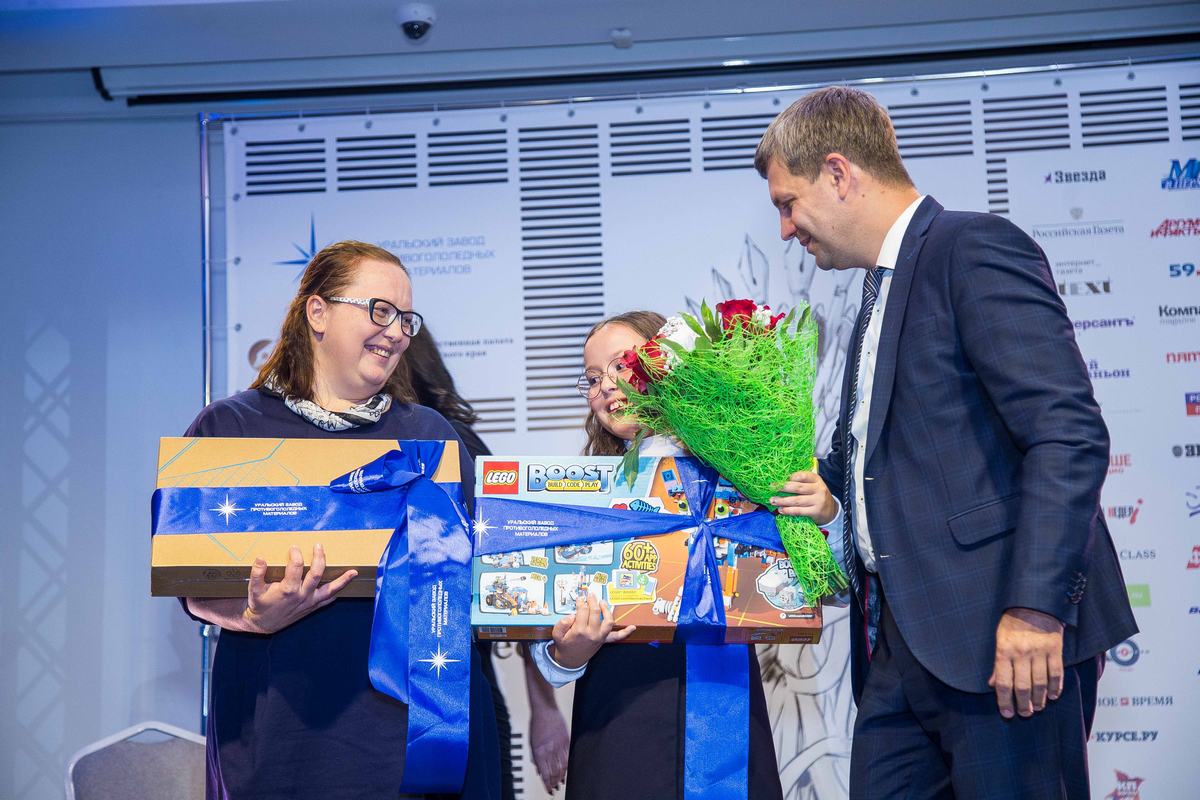 Наконец, ещё одного изобретателя наградил собственным призом спонсор церемонии — Уральский завод противогололёдных материалов, основанный Рустамом Гильфановым. Это крупнейший в России производитель современных многокомпонентных экологичных средств против гололёда, предназначенных для зимнего и межсезонного обслуживания городских дорог и тротуаров, аэропортов и других инфраструктурных объектов. Продукция УЗПМ эффективно работает и активно используется для борьбы с зимней скользкостью на всей территории РФ и за пределами страны. Неудивительно, что инновационное предприятие выбрало своим героем юного изобретателя.