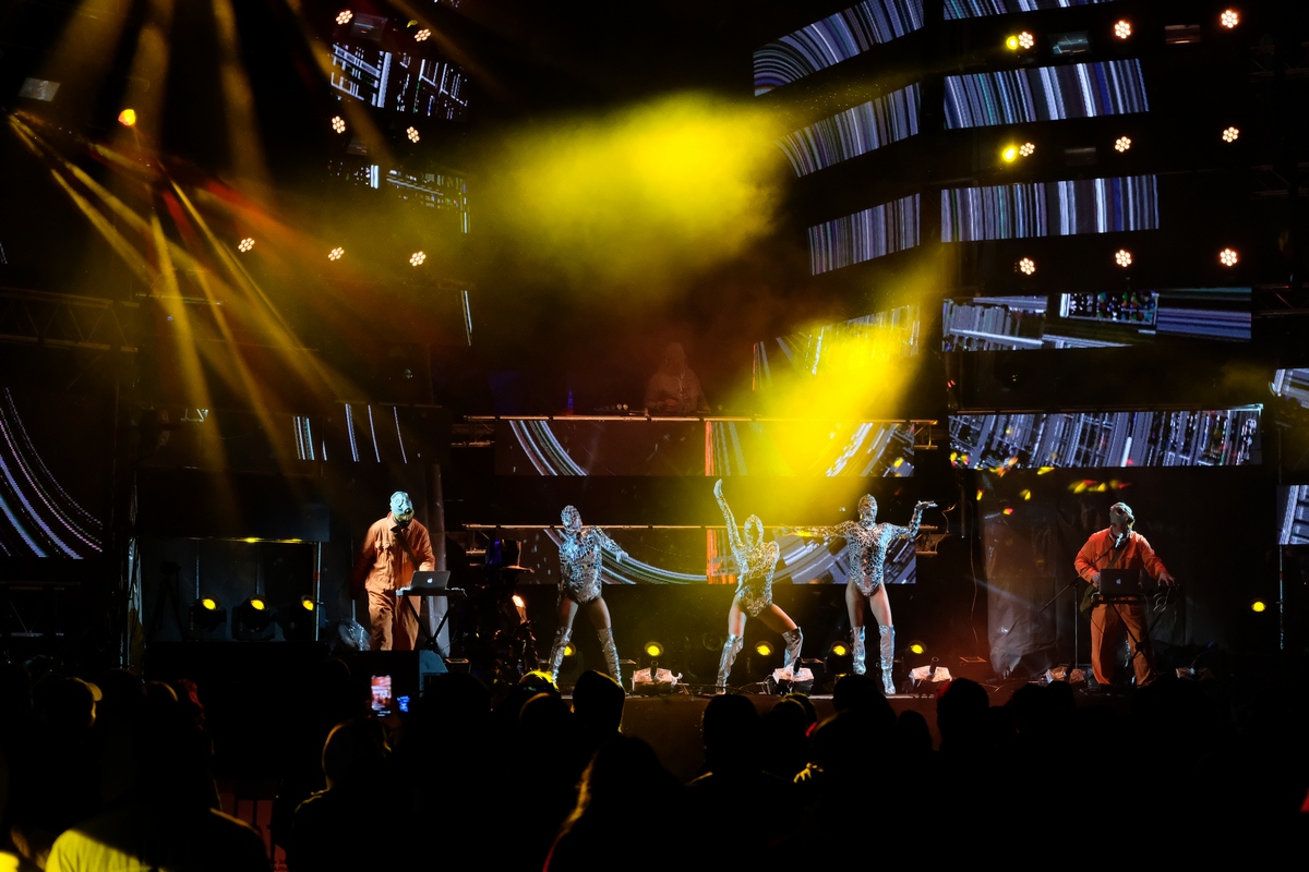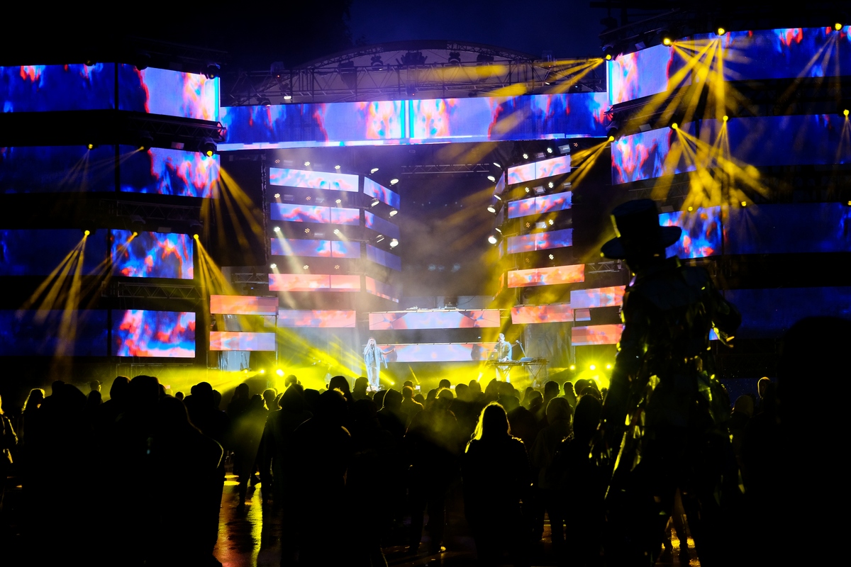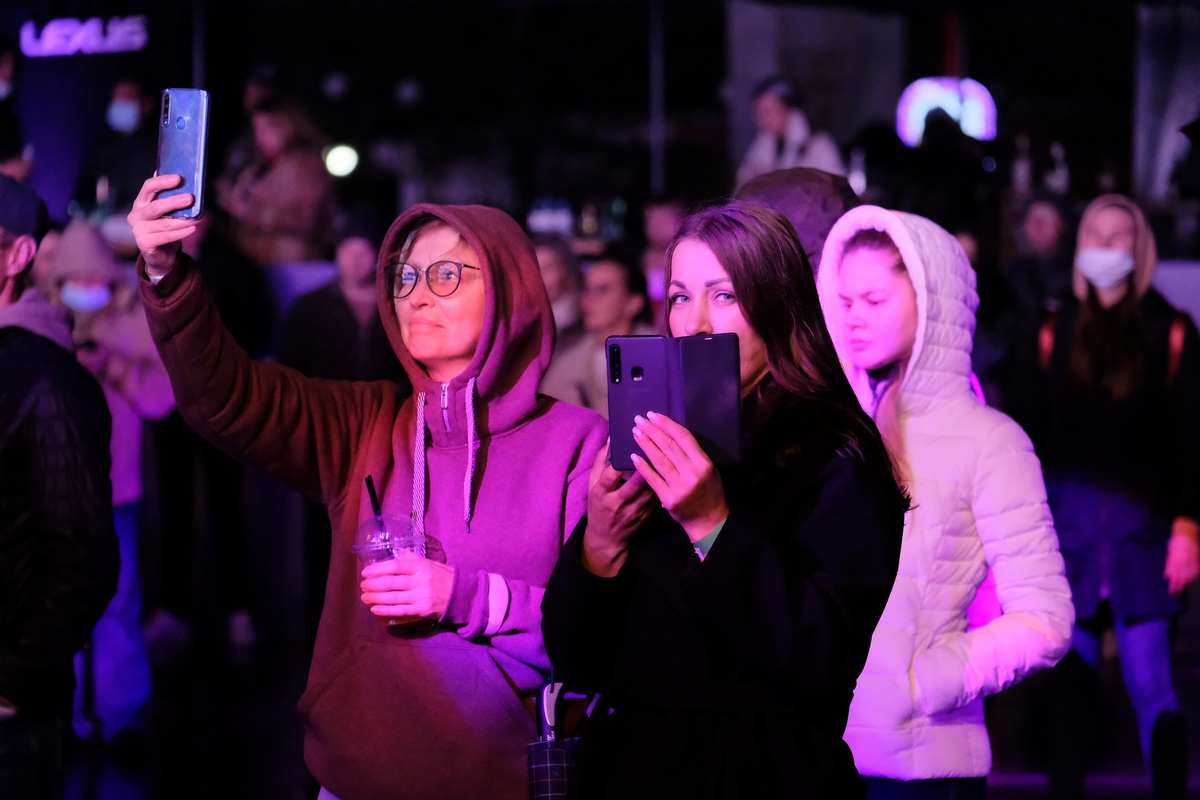 На сцене, обрамлённой 500 светодиодными экранами и пестрящей замысловатым виджеингом, энергично пританцовывали светящиеся фигуры (танцевальную поддержку фестивалю обеспечивали две команды: «Русский Hollywood» из Москвы и «Те самые» из Ярославля), приглашая последовать их примеру. Тинейджеров, компании стиляг среднего возраста, влюблённые парочки и даже целые семьи — в общем, всю разношёрстную публику, обутую в модные кроссовки всевозможных фасонов.