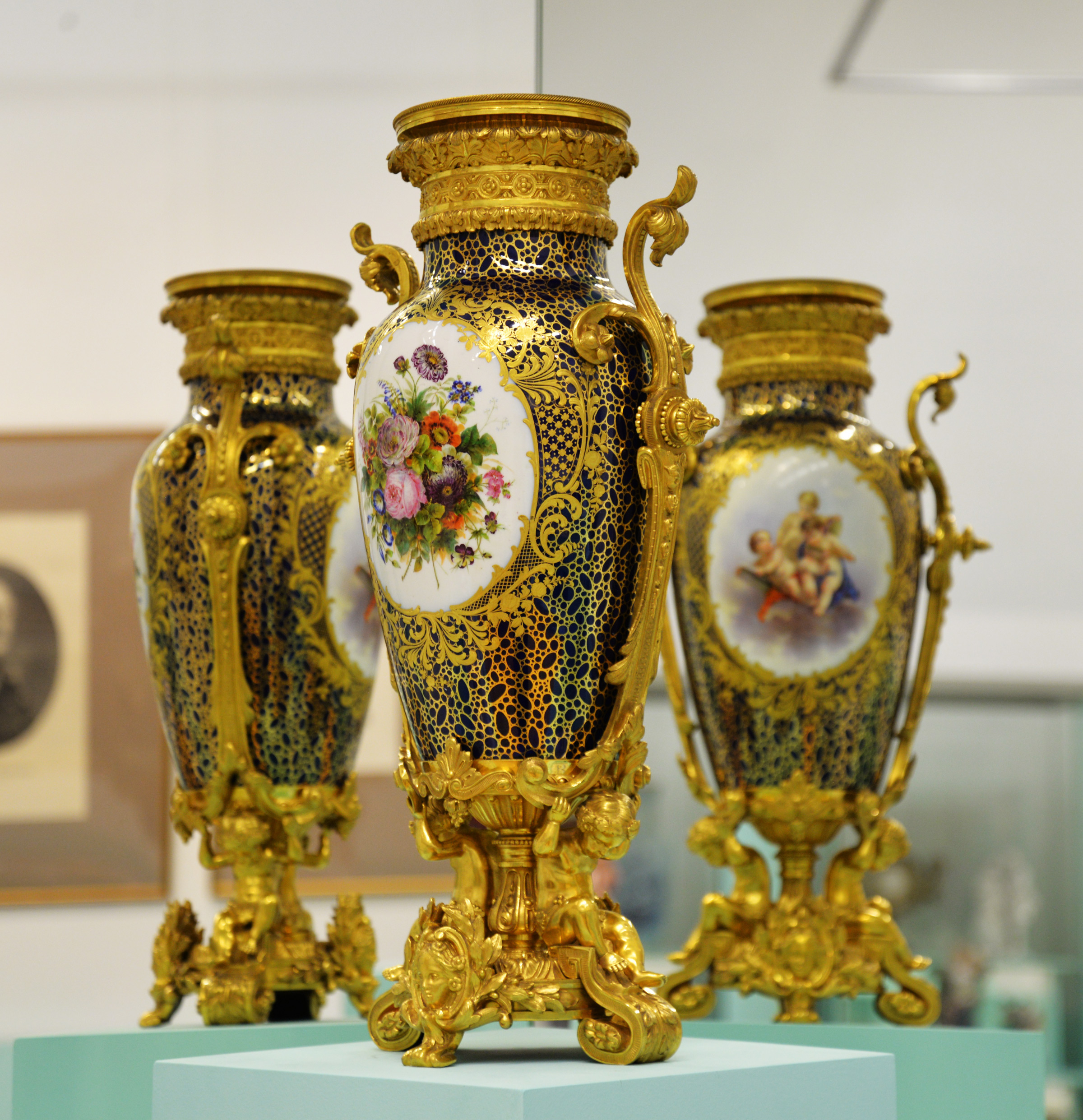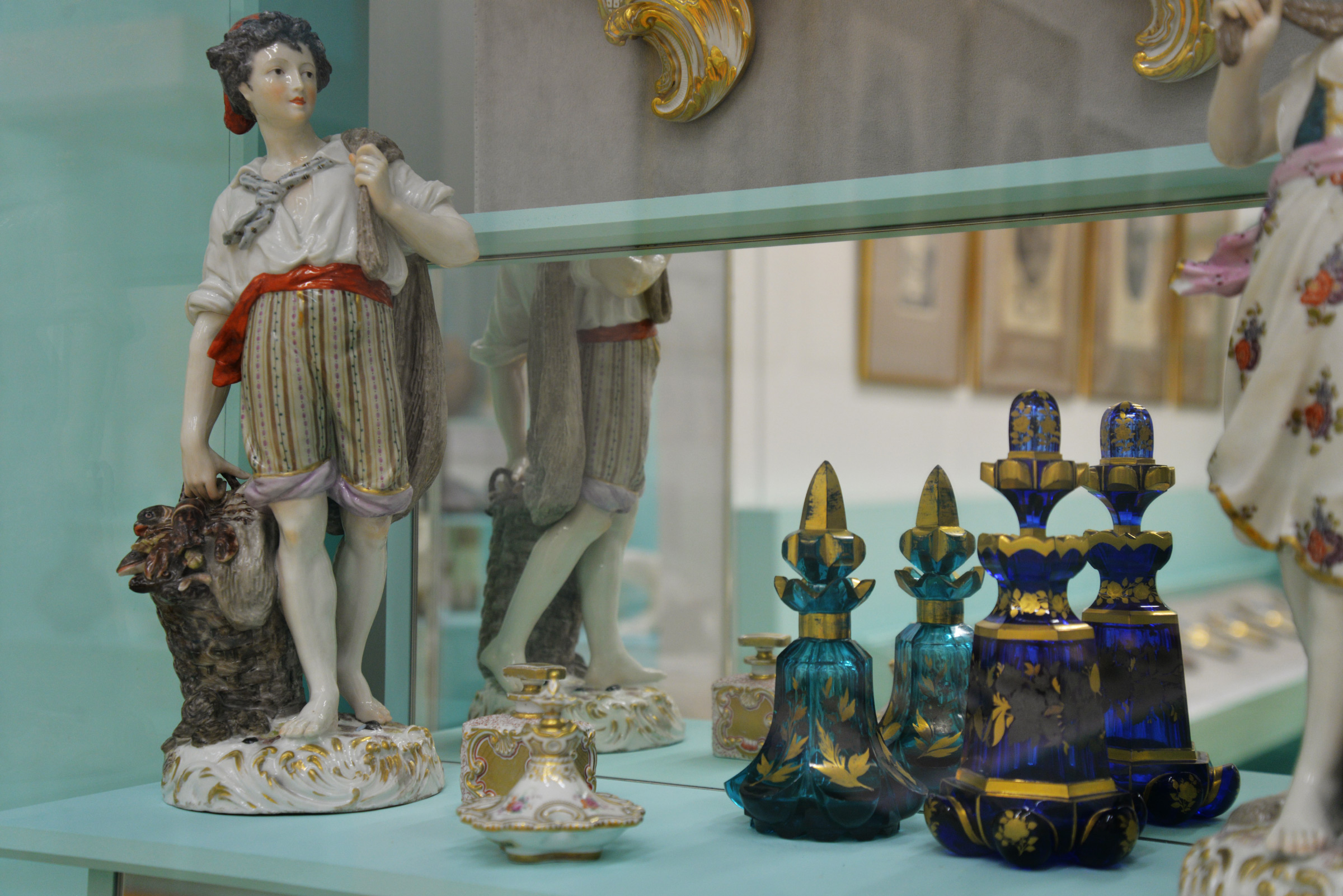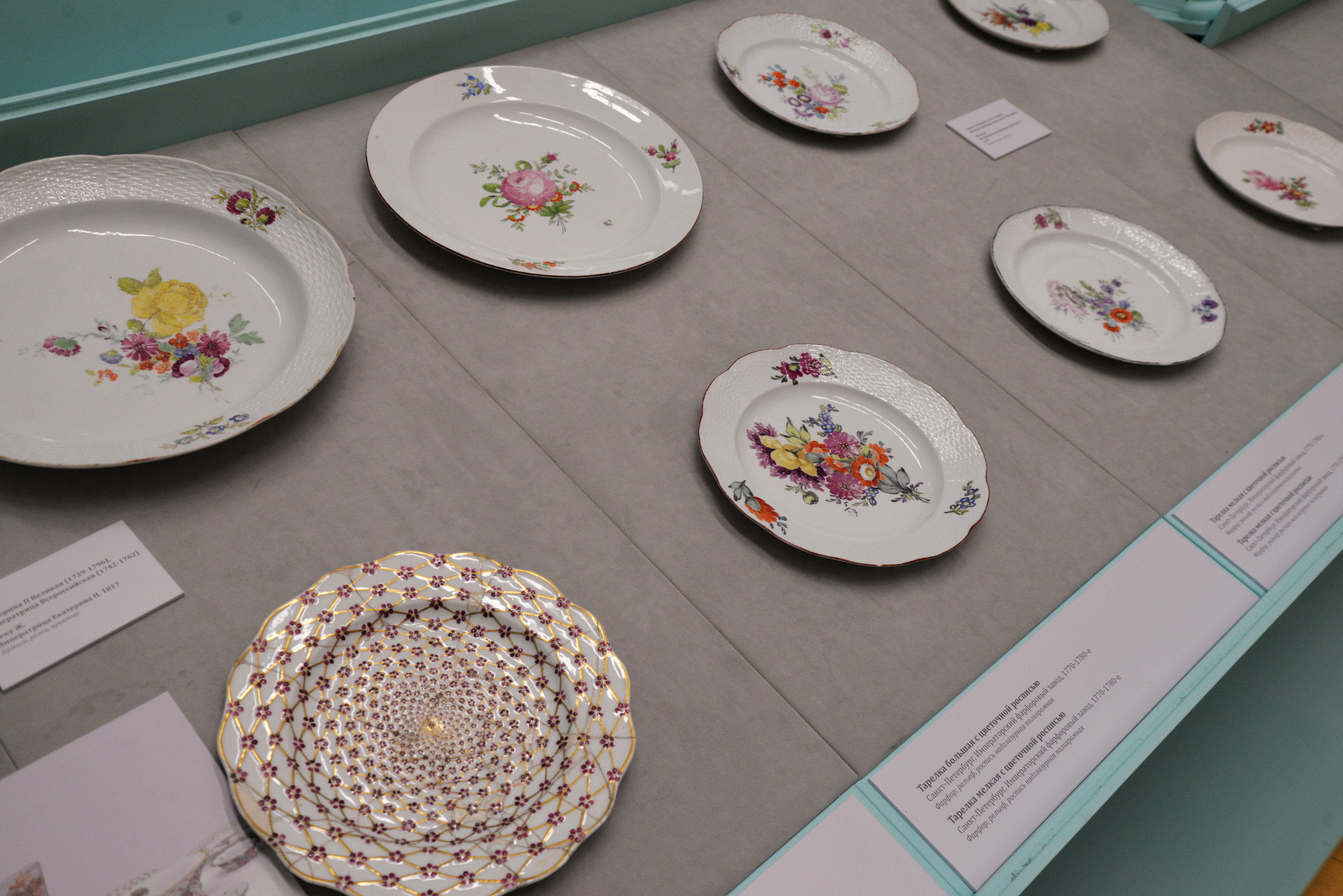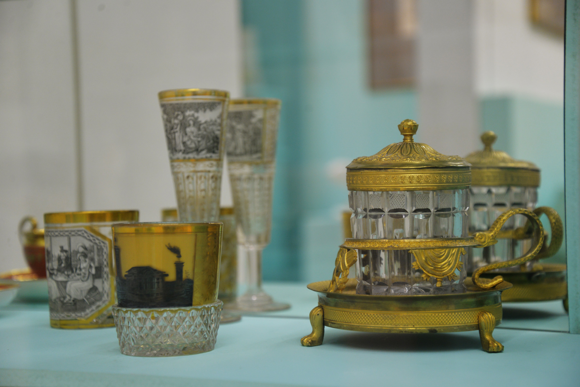 К сожалению, здесь нет ни одного полного сервиза. Да и невозможно это: настоящий парадный императорский сервиз мог насчитывать десятки тысяч предметов. Зато отдельные вещи весьма примечательны. Здесь есть не только посуда, но и статуэтки, кашпо, флаконы для духов, табакерки, литургические потиры, ароматницы, подсвечники и уже совершенно экзотические предметы вроде «рюмочной передачи». Так назывался специальный большой продолговатый сосуд с краями в виде крупных закруглённых зубцов. Сосуд наполнялся льдом, а между зубцами вставлялись рюмки; берёшь такую рюмку — а она холодненькая.