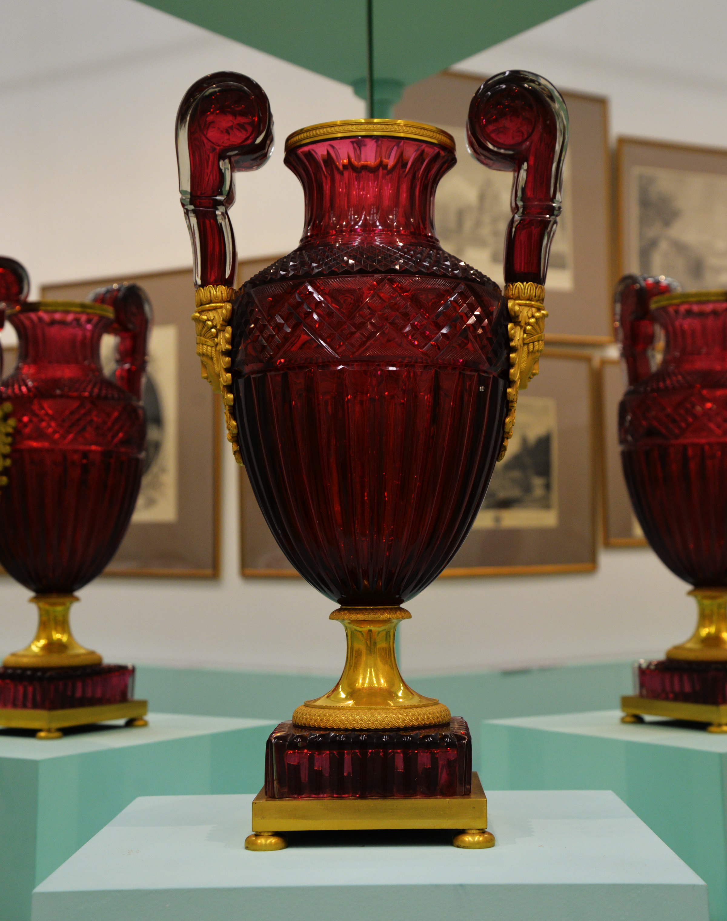 Фокусом всей экспозиции является большая парадная ваза из «рубинового» стекла, декорированная позолоченной бронзой — её ручки украшены маскаронами. Как и у многих других предметов на выставке, у неё непростая история. Таких ваз в 1829 году было изготовлено четыре. Одна из них хранится в Эрмитаже, другая в Государственном историческом музее, третья здесь, в Перми. Судьба четвёртой неизвестна. Любопытно, что пермская ваза была получена галереей в дар в 1993 году от коллекционера-частника.