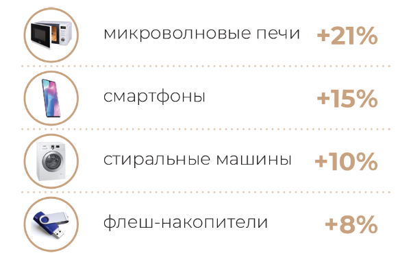 — Рост цен на смартфоны, флешки и микроволновки может быть связан со смещением рабочих мест на дом и, следовательно, возросшим спросом на электронику. Логично, что потребитель мог чаще покупать, например, микроволновки, которыми раньше пользовался на работе. Флешки и смартфоны могли стать более востребованы из-за необходимости иметь нужное программное обеспечение и файлы под рукой.