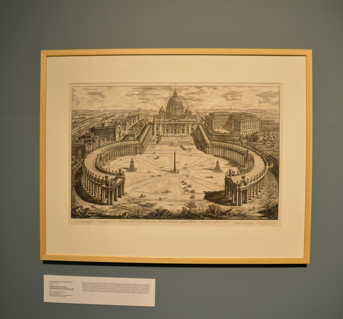 Итальянская гравюра представлена офортами Джованни Батиста Пиранези — архитектурными пейзажами, которые парадоксально сочетают в себе точность и фантазию. Будучи архитектором по образованию, Пиранези позволял себе превращать зарисовки с натуры в архитектурные сочинения: так, Пантеон показан с такой точки, которой на самом деле не существует, — видны сразу портик, боковой фасад и купол. В реальности Пантеон таким увидеть нельзя, но у Пиранези это сделано максимально достоверно во всём, что касается пропорций и архитектурных деталей. Собор святого Петра в Ватикане и площадь перед ним Пиранези изобразил сверху, хотя, представьте, у него не было ни вертолёта, ни квадрокоптера.