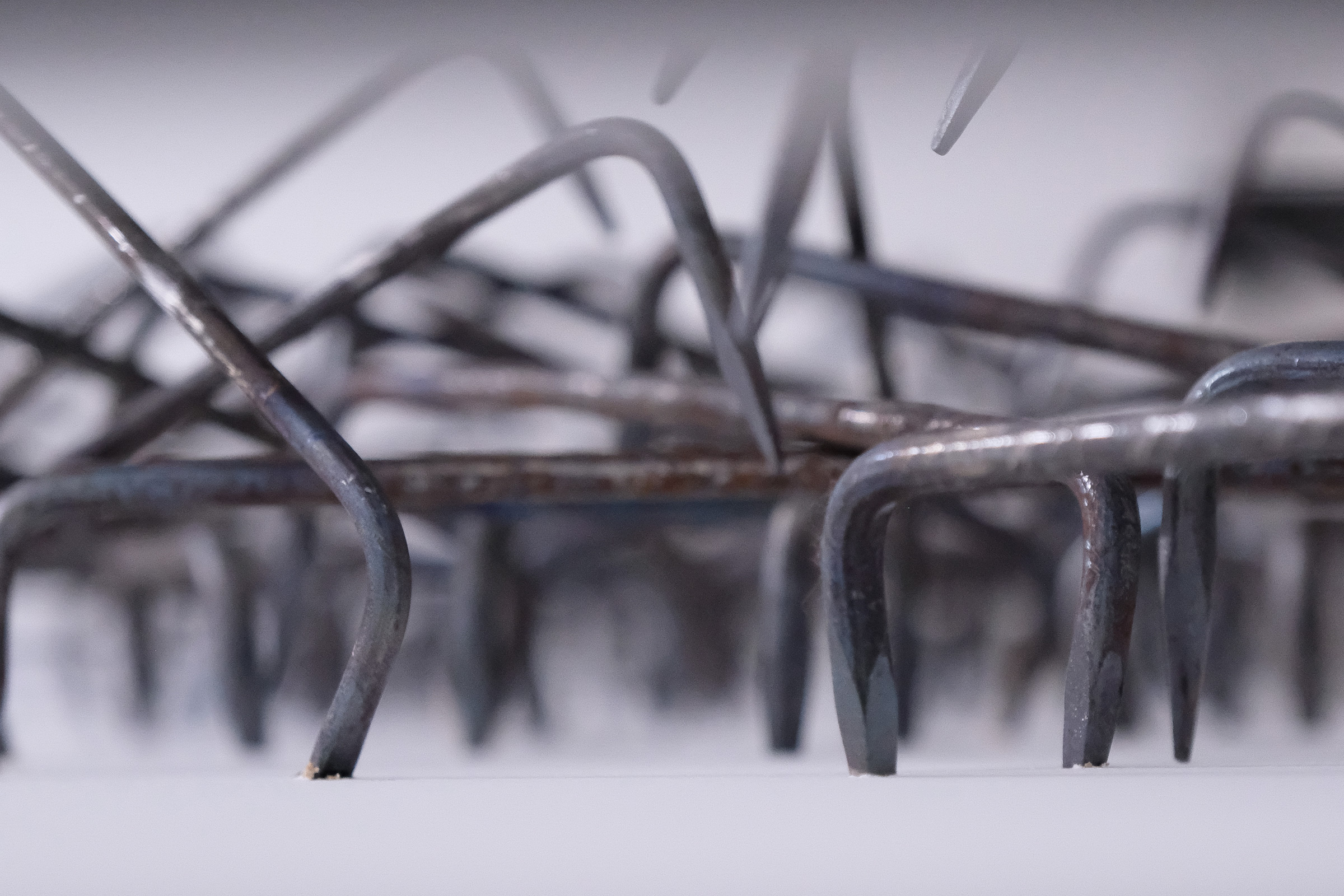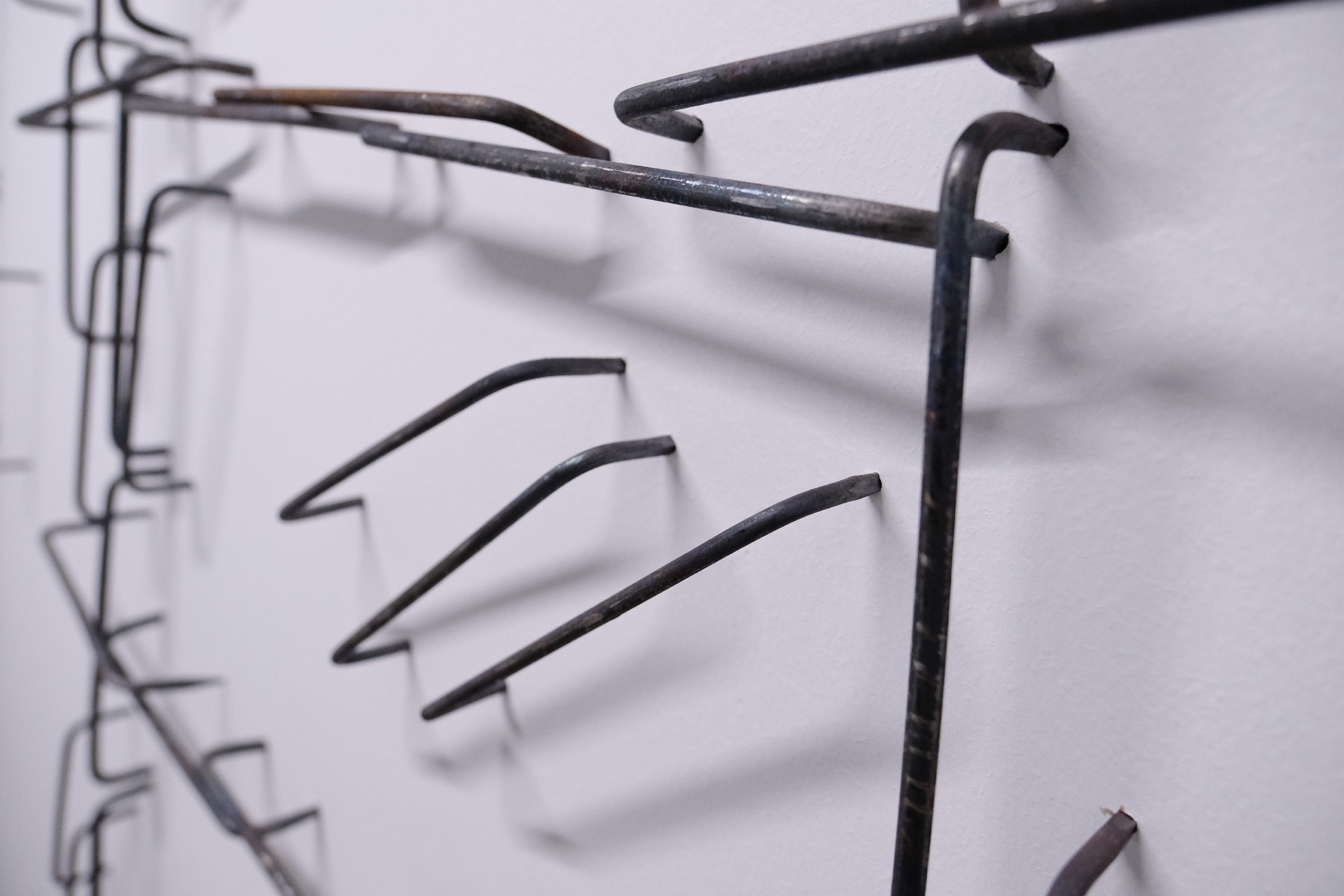 Атмосфера на выставке меланхоличная и медитативная. Минималистические, вдумчивые инсталляции заставляют зрителя «залипать», застревать посреди времени, не замечая ритма реальной жизни. Здесь сталкиваются вечное и сиюминутное, прочное и хрупкое. Здесь реальность прорывается в художественную среду вопреки сопротивлению материала, а материал — всё те же скобы — преодолевает зрительские стереотипы и стремится к свободе самовыражения.