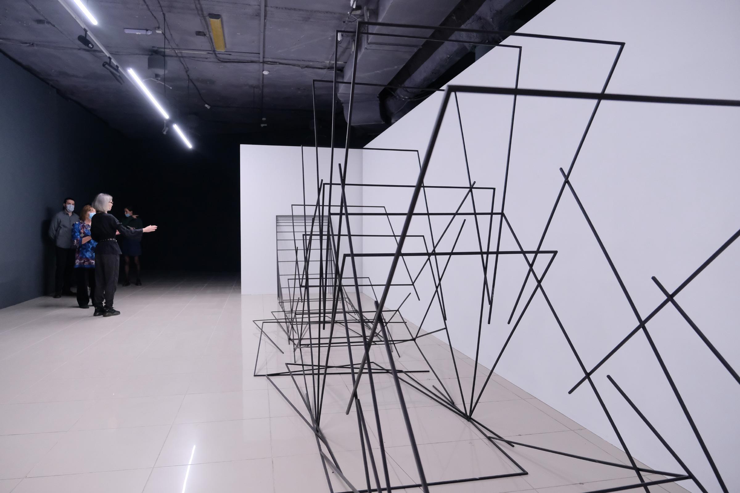 Ради чего всё это происходит, становится понятно на третьем этаже. Здесь скобки становятся материалом для создания архитектурных конструкций, самая большая из которых — ажурная инсталляция, тонкая, причудливая и очень упорядоченная. Кажется, что она невесома и хрупка, как карточный домик, тронь — и развалится. Но на самом деле скобки закреплены прочно, хотя и незаметно. Это, между прочим, очень важное архитектурное качество — видимая хрупкость и невесомость при реальной прочности и устойчивости. Конструкция очень декоративна — это объёмный геометрический орнамент, который мог бы украсить настоящее здание или большой интерьер — какой-нибудь холл отеля или атриум торгового центра.