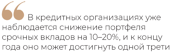 Это может создать реальную угрозу формированию ресурсной базы кредитных учреждений, соглашается с прогнозом аналитик ГК «ФИНАМ» Алексей Коренев. «Есть потенциальный «ограничитель снизу» — та планка, ниже которой объём вкладов не снизится. Он формируется двумя типами вкладчиков: пожилые люди, которые копят деньги «на старость и на похороны», и богатые люди, диверсифицирующие свои инвестиции. Эти деньги с депозитных счетов кредитных учреждений почти не уходят и, скорее всего, не уйдут», — говорит эксперт.