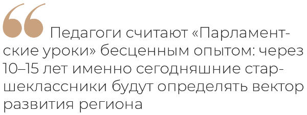 «Парламентские уроки» в очередной раз дали молодому поколению уникальную возможность проявить себя, высказать своё мнение, а главам муниципальных образований — по-новому, свежим взглядом посмотреть на возможное решение существующих проблем. Как считает Наталья Горбацевич, декан Педагогического факультета РИНО ПГНИУ, проблемы муниципалитетов стоит обсуждать именно с молодым поколением. Порой они знают о них лучше, чем взрослые, потому что они там живут, играют, двигаются, обсуждают, планируют свою жизнь. «На этих уроках мы вместе с детьми рассуждаем, что актуально для будущего поколения ребят, которые будут здесь жить и заниматься развитием нашего края, — рассказывает Горбацевич. — Я думаю, что для сегодняшних взрослых это и большое подспорье, и большая поддержка».