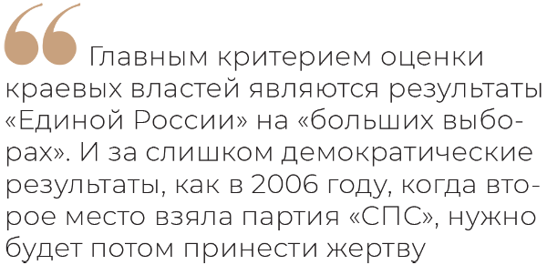 Как известно, главным критерием оценки краевых властей являются результаты «Единой России» на «больших выборах». И за слишком демократические результаты, как в 2006 году, когда второе место взяла партия «СПС», нужно будет потом принести жертву (тогда Николаю Яшину пришлось оставить пост главы администрации).
