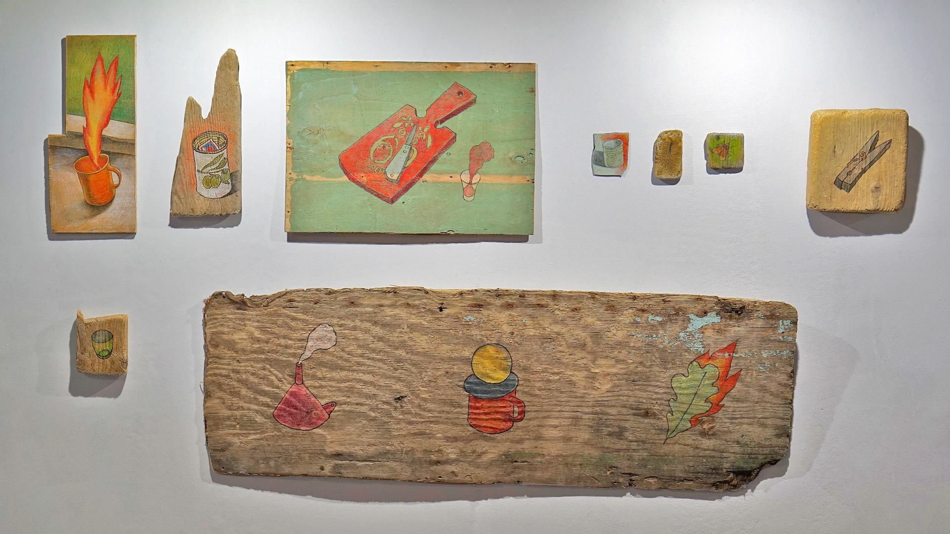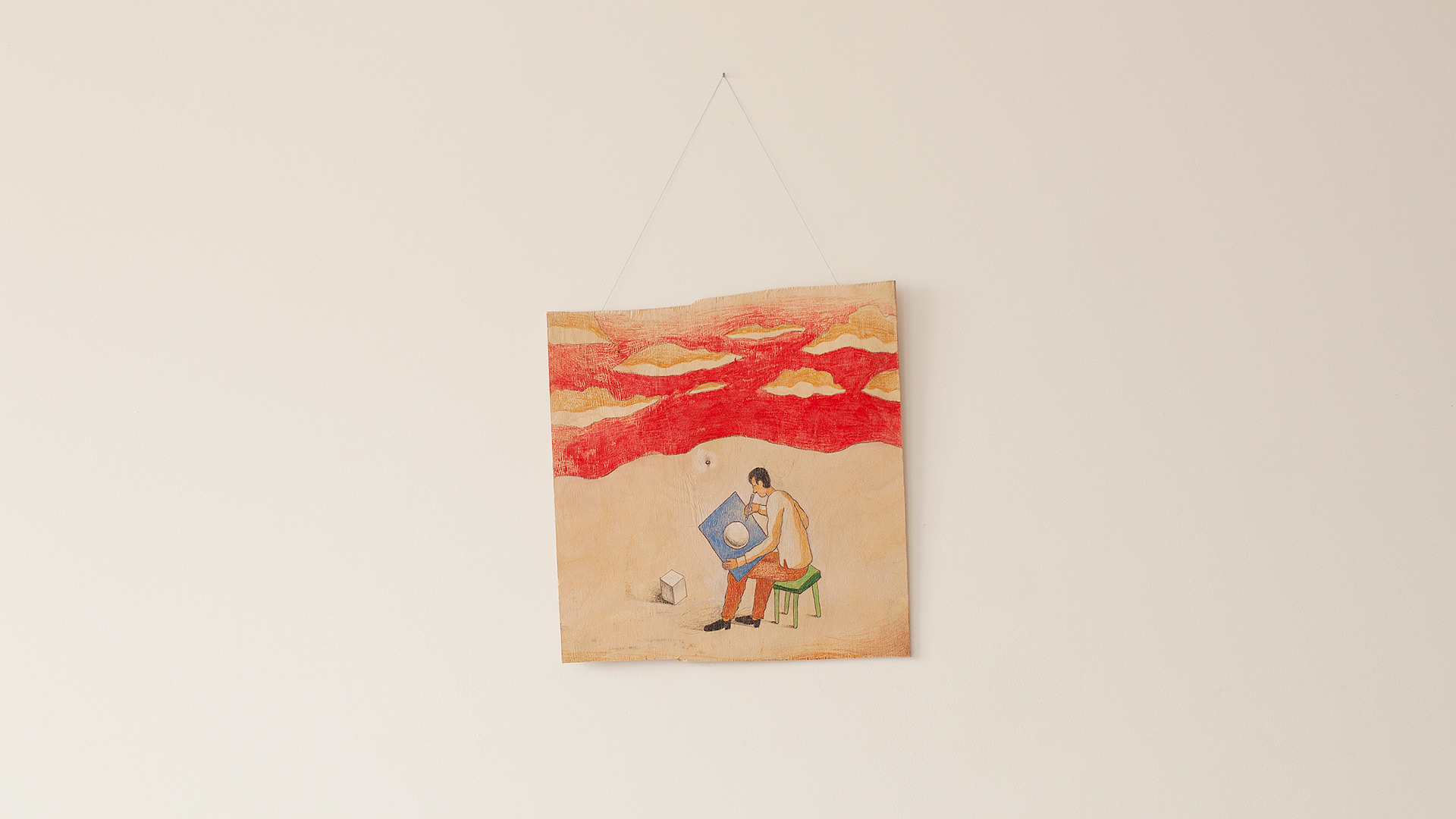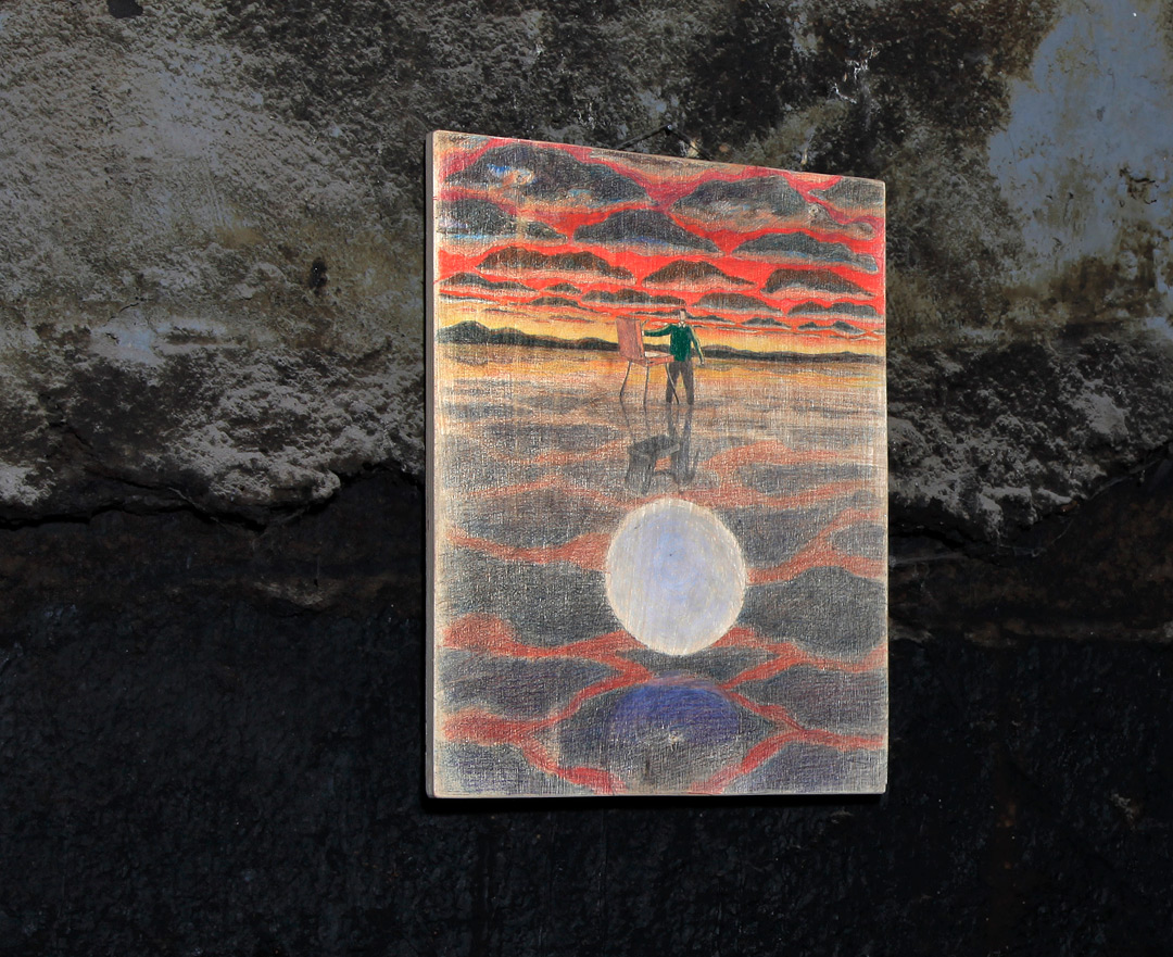 — Вот, например, «Художник и обстоятельства». На ней, собственно, художник, он рисует совсем не то, что видит. Эмоция в целом очень тревожная. Но она как бы отделена от художника, он ещё не знает, какая она. Герой лишь пытается интерпретировать, что он видит, и таким образом понять, что за эмоция внутри него. Примерно так же действую и я. Во время пленэра я пытаюсь выразить моё внутреннее состояние через выбор объекта, через текст (очень люблю внедрять текст в рисунок). Пленэр у меня — это время для себя. В одиночестве я даю себе возможность замечать все эмоции внутри меня. Это способ замедлиться и увидеть то, что внутри задавлено и что требует выражения, осознать это. Поэтому пленэр — это ещё и способ терапии, освобождения от того, что вытеснено, что могло бы в будущем стать причиной тревоги или привести к каким-то другим последствиям. «Лирический концептуализм» я назвал бы поддерживающей творческой терапией.