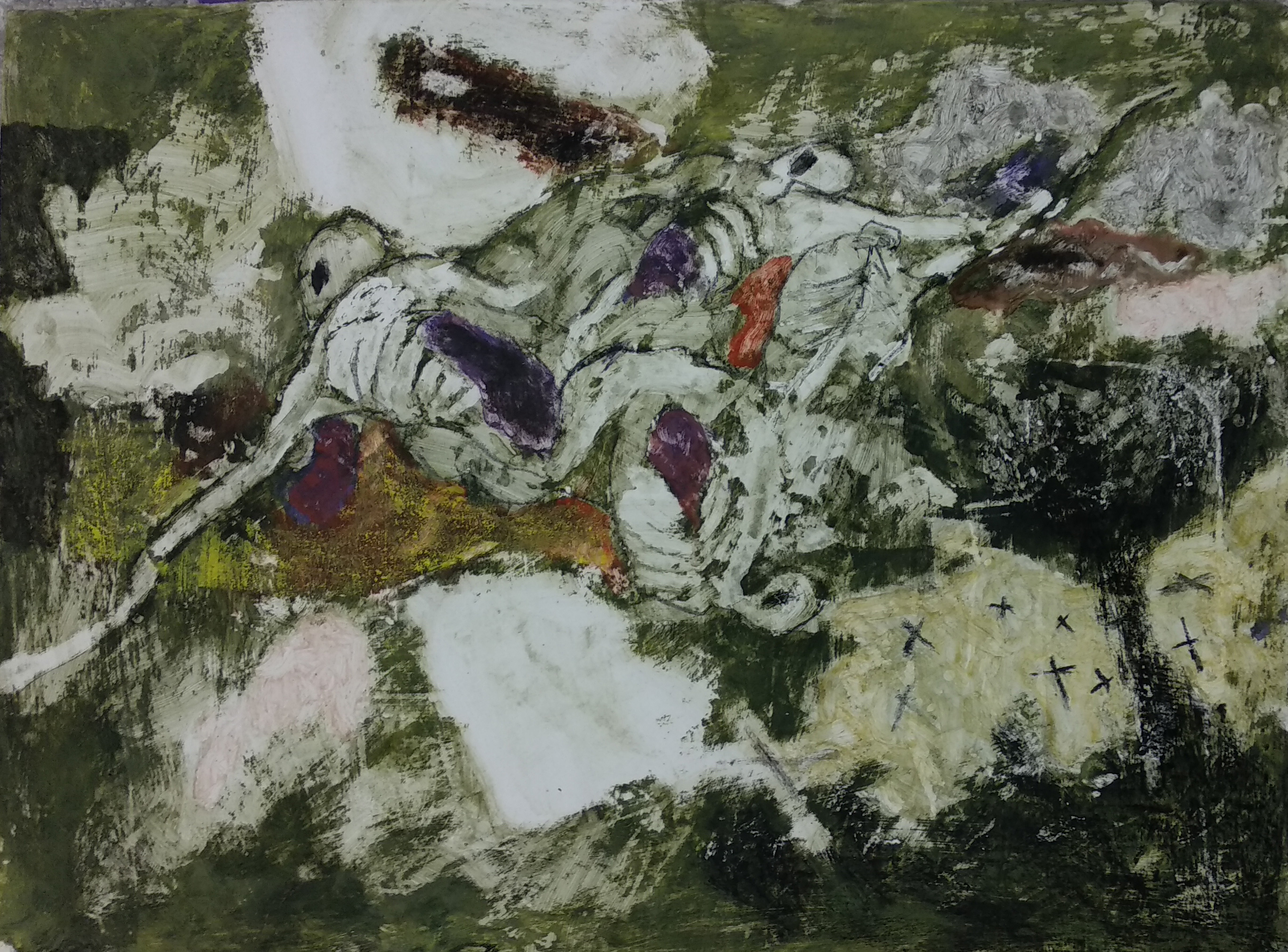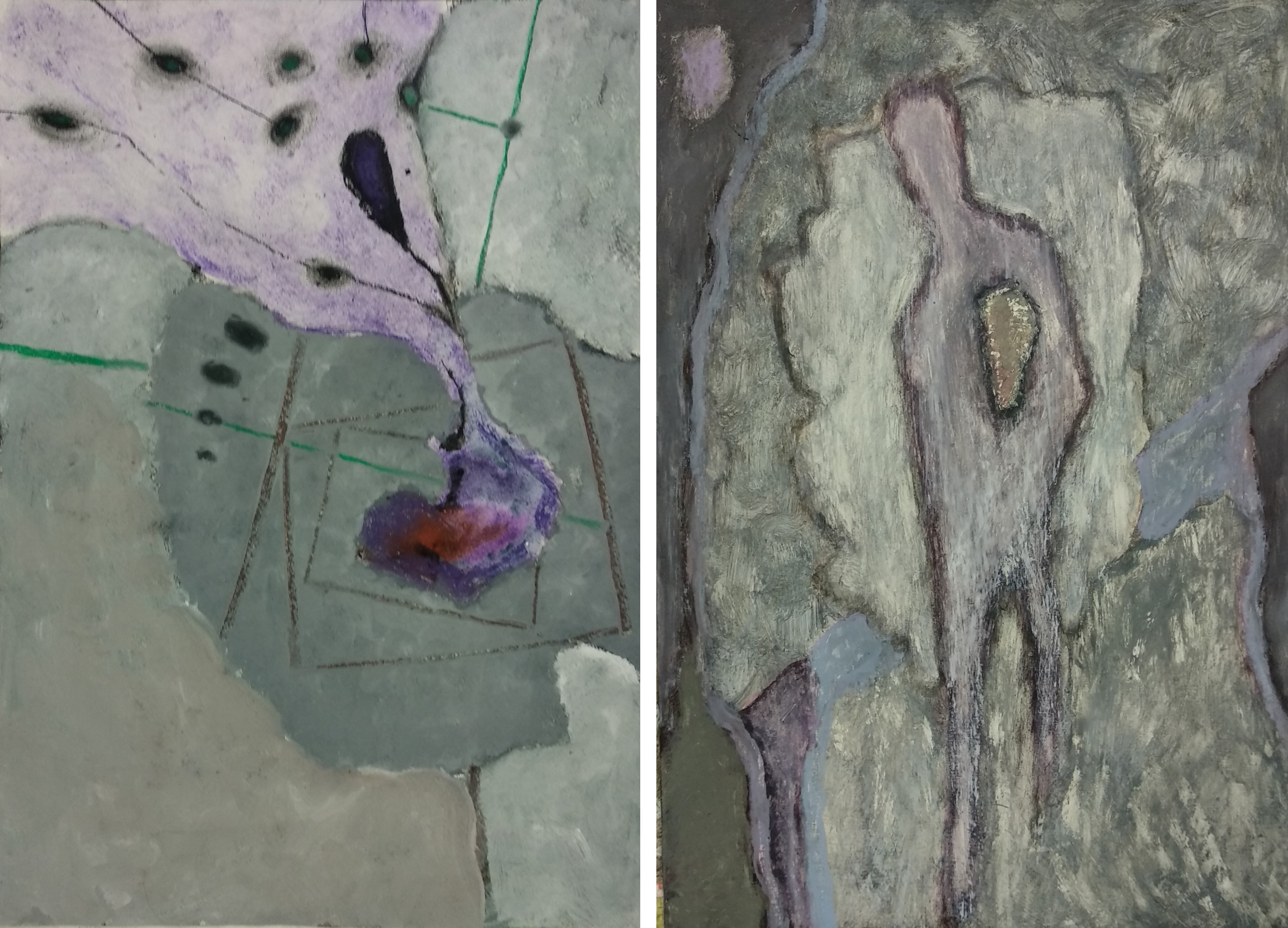 — Это была серия из четырёх работ. Пейзажи с грозой. Они родились из ситуации. Я в последний раз гулял на родине моей матери, в деревне за Кунгуром. Я там часто бывал в детстве. И вот приехал уже взрослым. Ходил там, бродил, и шла туча со стороны Кунгура, всё небо затянуло. Я никуда не стал бежать и прятаться не стал. Я просто сидел под сильнейшим ливнем, меня почти смыло, в траву вдавило, было тяжело дышать. Сделал фотографии той грозы. Через три месяца после возвращения я вспомнил про них и написал четыре работы про то моё состояние. Я понял, что в ту грозу случилось моё подсознательное прощание с тем местом. Я интуитивно понимал, что больше никогда не вернусь туда.