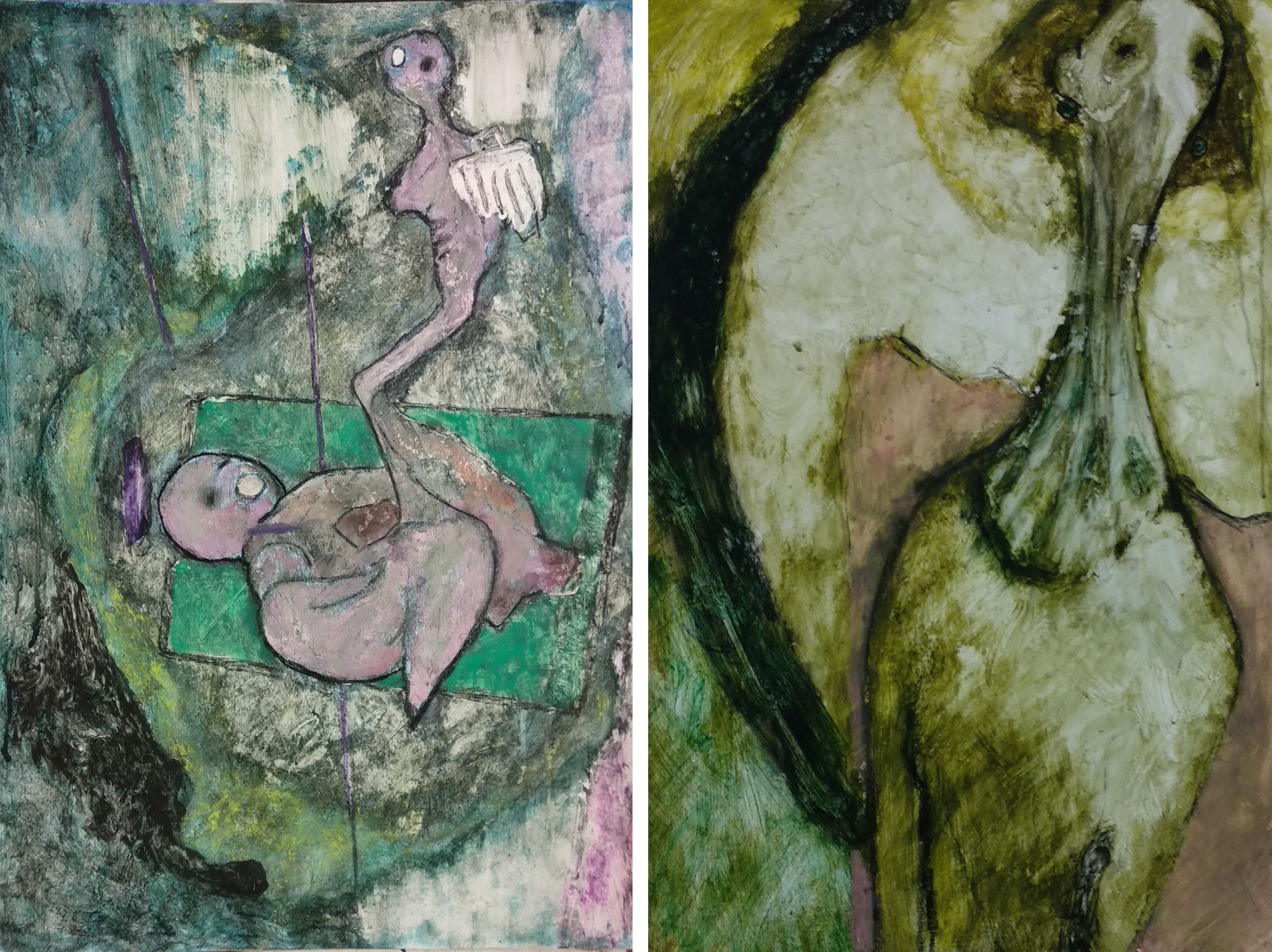— Ни по какому, что в голове родится в тот момент, то и выплёскивается на бумагу. Эта тема немного абстрактная. Потому что для меня нет разделения на волшебных существ, ангелов, демонов, богов... Всё это — одна сущность или существо. Это неопределённое нечто, которое может тебя коснуться и которому только твоё сознание, твой взгляд могут придать какую-то форму. Сейчас существ уже штук 50, наверное. Я не даю им названия, они у меня «никакие». Они рождаются из воздуха и там же погибают. Там нет никаких конкретных силуэтов, но они всегда антропоморфны. Они ни на людей, ни на ангелов, ни на домовых не похожи. Они все разные. Я пока нигде не выставлял эти работы.