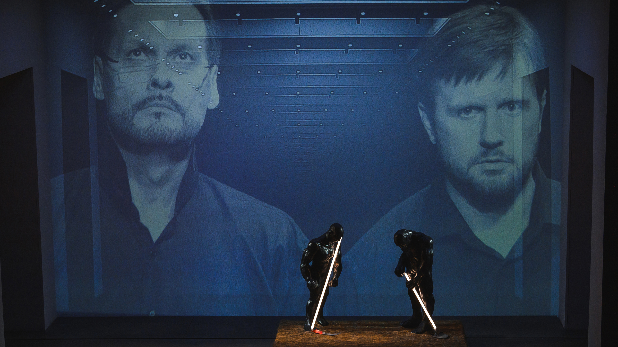 Правда, позже трансляция возобновилась. В это время пространство «музея» на сцене благодаря видеоэффектам начало продвигаться вглубь, «белый куб» превратился в белый коридор, бесконечный, исчезающий где-то вдали, возможно, в той самой загробной реальности, куда мраморный Командор утащил Дон Жуана.