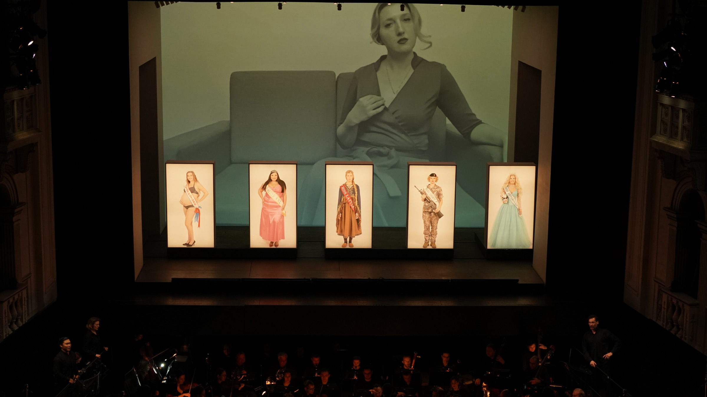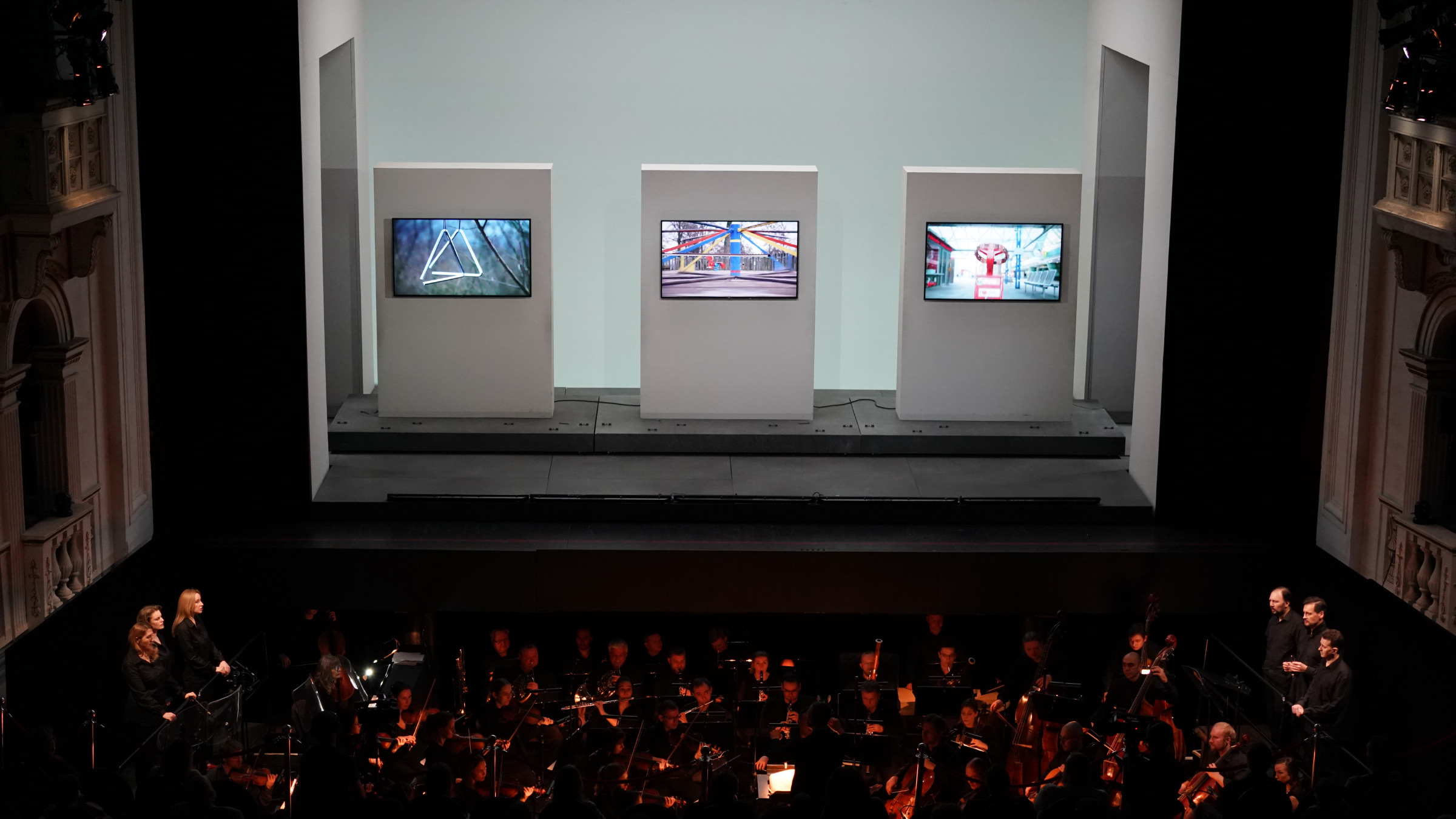 Да, это всё, что мы видим на сцене. Ничего другого не будет, певцов тоже. Они в онлайне, на самоизоляции, в трансляции. Точнее, они вместе с оркестром — в оркестровой яме, а на сцену проецируются их изображения. Две камеры снимают артистов, а видеорежиссёр микширует эти изображения. Получается как в музыке: то соло, то ансамбль; то один на первом плане, то другой. Подобный приём используют на больших рок-концертах: чтобы всей многотысячной толпе было видно исполнителей, действие транслируют на большой экран.