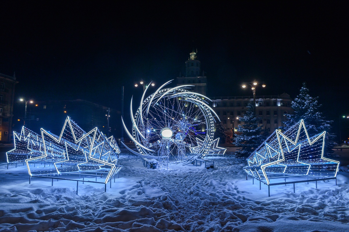 В Перми завершено новогоднее оформление зданий, улиц, парков и скверов. Также оформлены 12 ледовых городков и ледовых пространств с 56 арт-объектами.