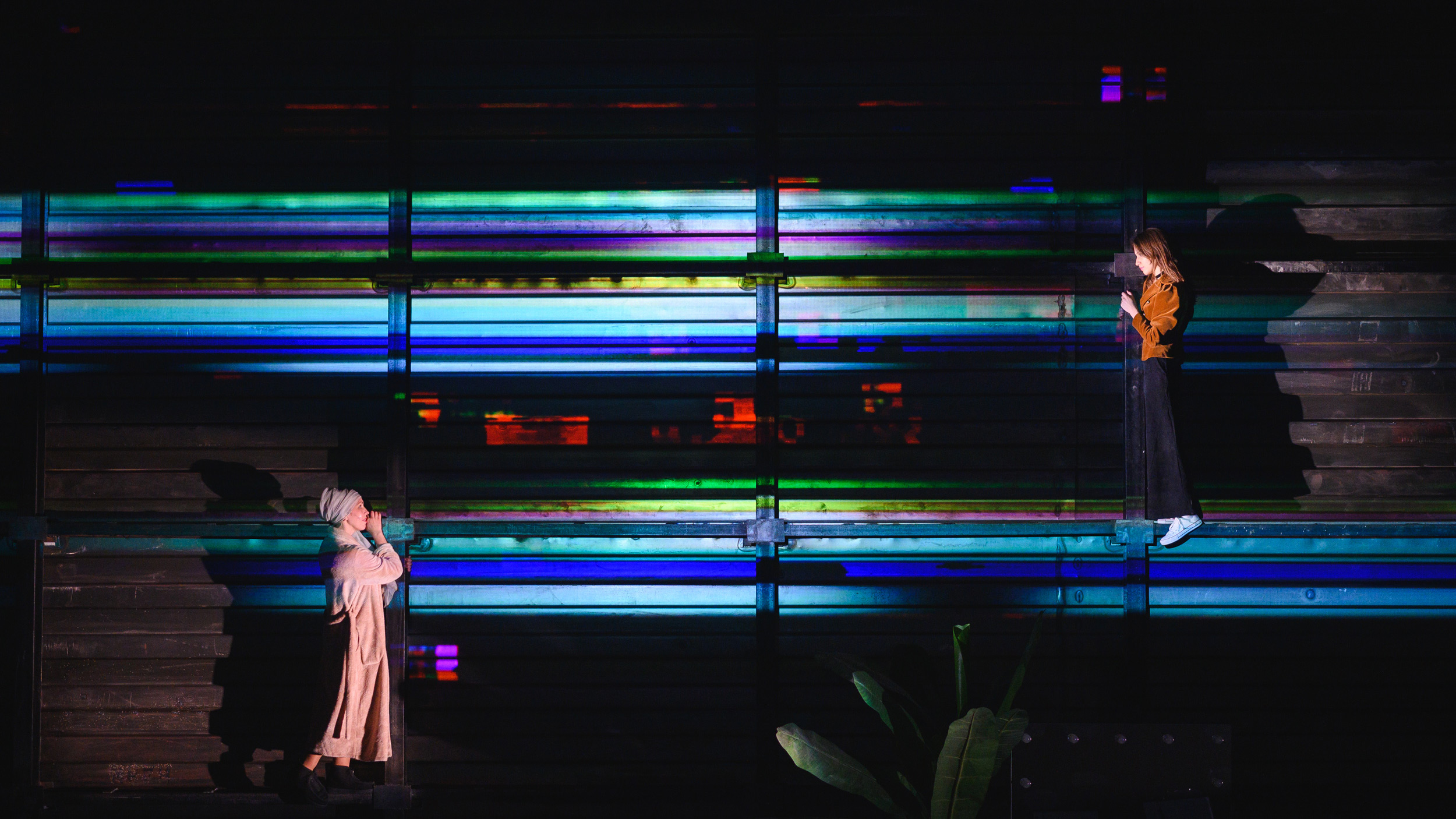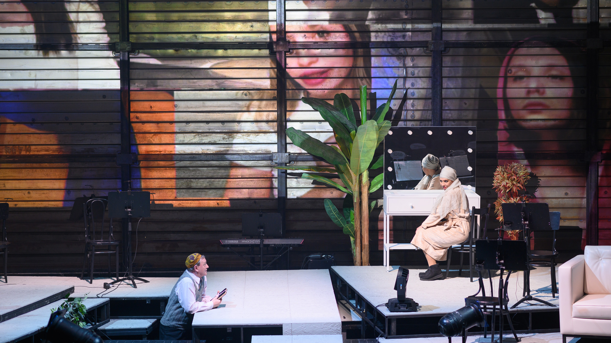 Всё действие происходит перед пожарным занавесом, на авансцене, которая плавно переходит в зрительный зал — плоскими широкими уступами. Необычная конфигурация сцены даже привела к некоторым логистическим неудобствам: зрителей, которые купили билеты в первые ряды партера, пришлось пересаживать в амфитеатр. Кстати, смотреть этот спектакль надо именно из амфитеатра: артисты то и дело выходят в проход между амфитеатром и партером, так что зрителям, сидящим впереди, приходится выворачивать шеи.