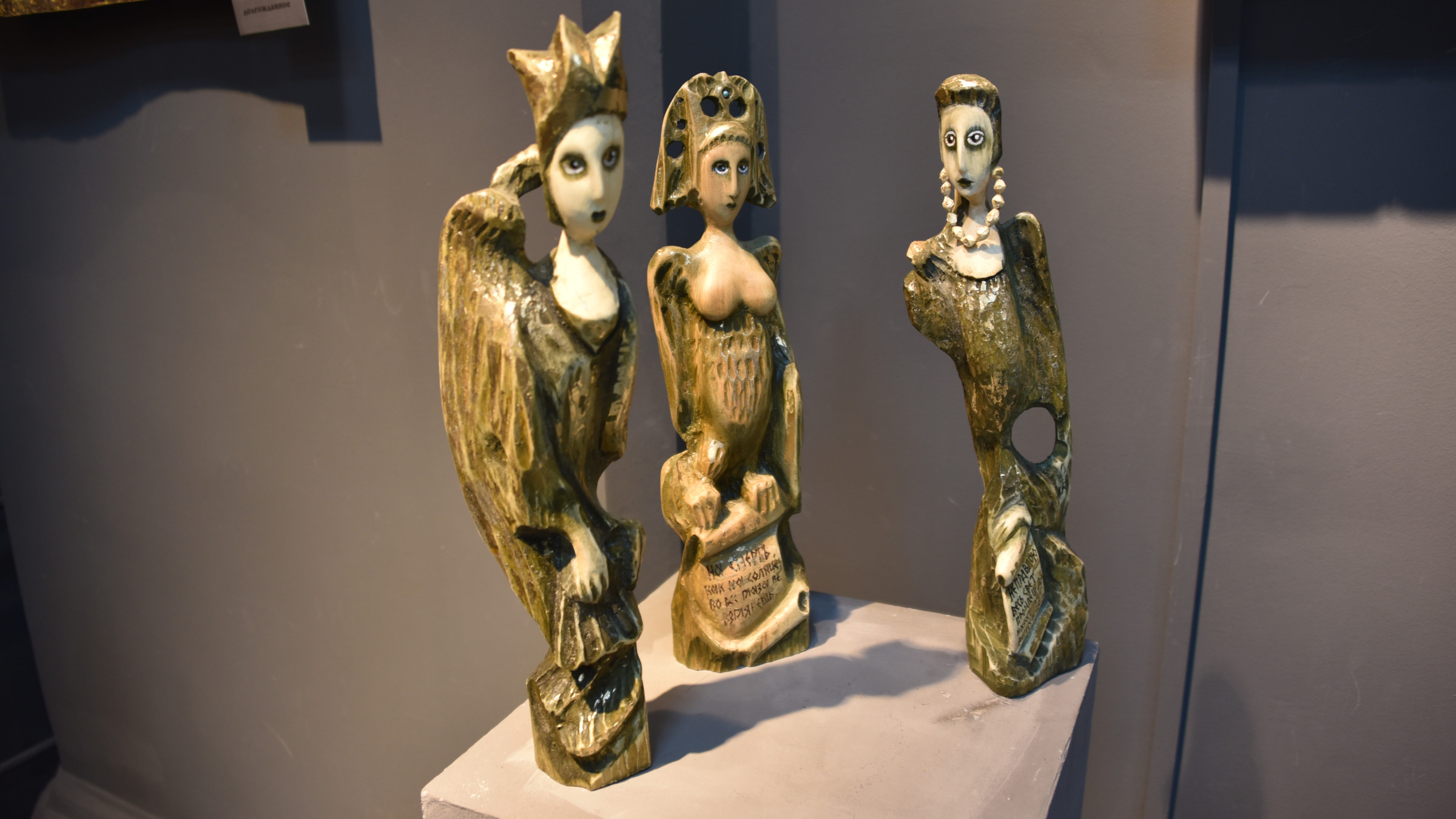 Выставка называется «Поленница» (0+), с поленницы всё и началось. Привёз Юрий дрова для печки, а дрова такие хорошие, крепкие, фактурные… Жарков вообще человек очень рачительный, всё, что может пригодиться в творчестве, не выбрасывает, а прибирает. Крепкое деловое дерево грех сжигать, и поленница постепенно начала превращаться в деревянную скульптуру.