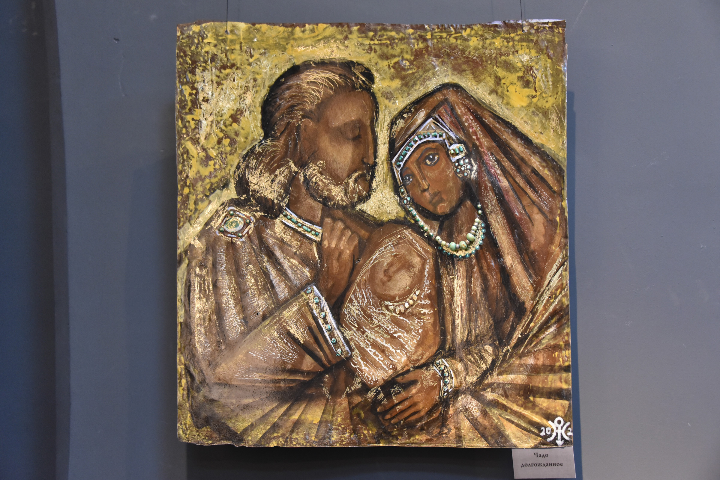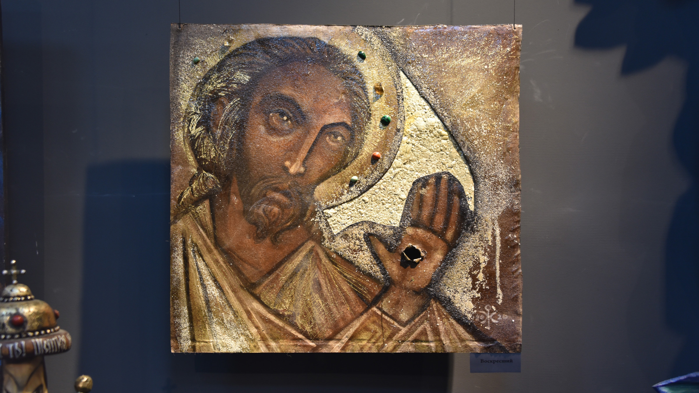 Живопись, который в экспозиции не намного меньше, чем скульптуры, — плод того же деревенского творчества и того же подхода к материалу. Библейские сюжеты и иконописные лики созданы акрилом на металле. Это старое кровельное железо, ещё один «бедный» материал, а кто бы мог подумать! Металл дарит картинам торжественное сияние, которое подчёркивает позолота (Жарков очень её любит, в некоторых скульптурах даже избыточно). И опять-таки фактура подсказывает сюжеты: в «Воскресшем» на ладони Христа — отверстие от гвоздя. Оно и правда от гвоздя… которым лист металла прибивали к стропилам.
