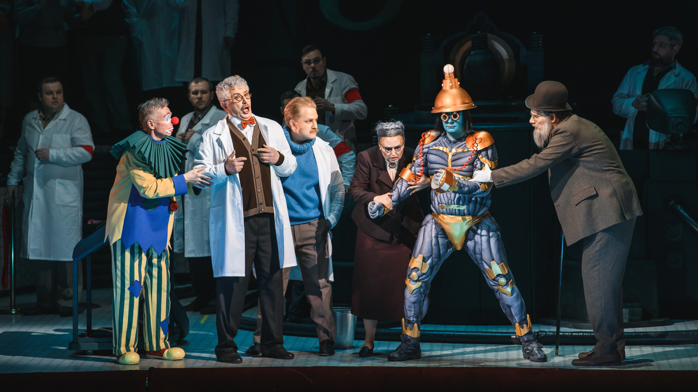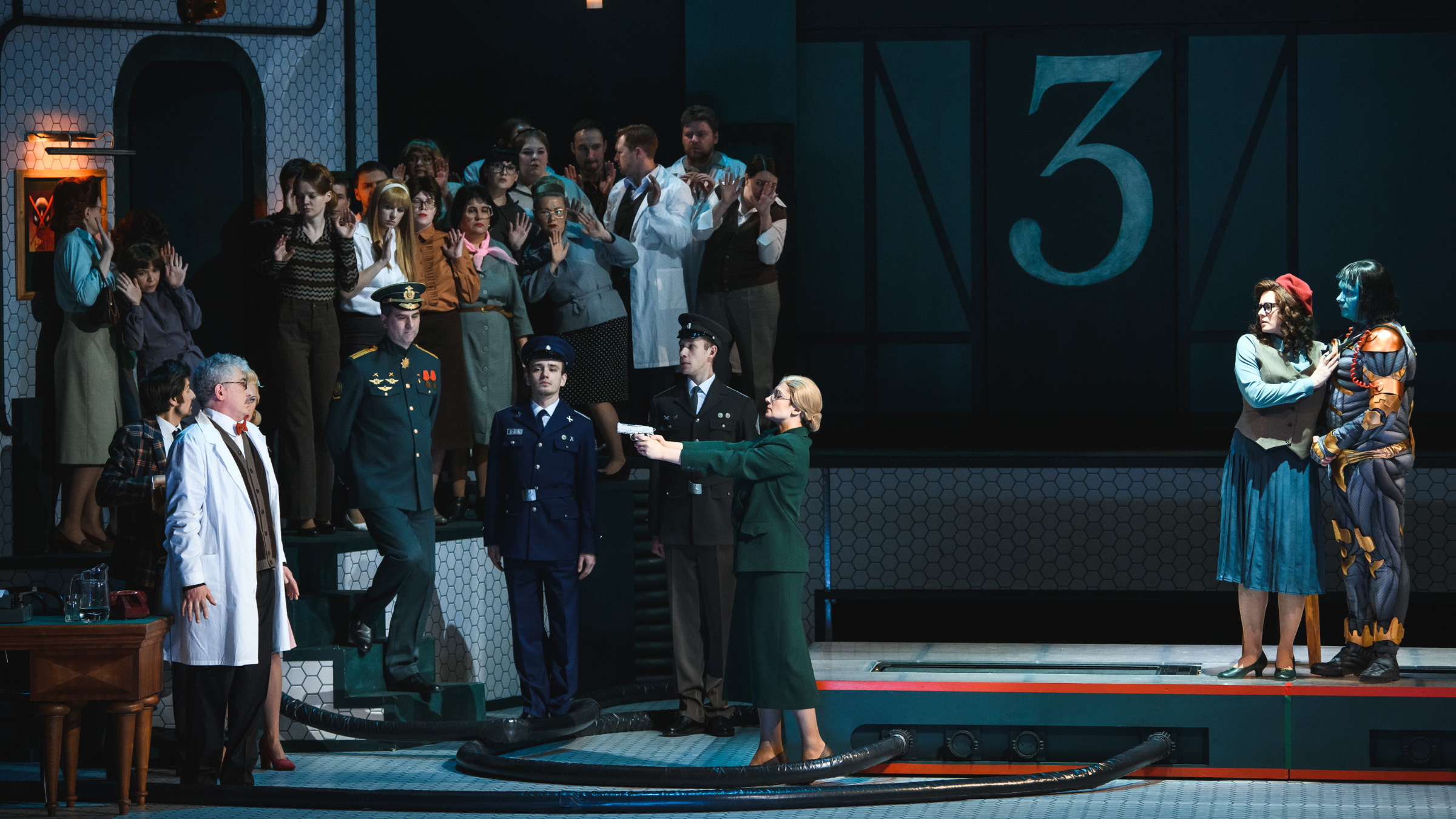 На сцене многолюдно, и все персонажи не просто присутствуют и (иногда) поют, но и активно действуют. Одного просмотра мало, чтобы заметить все мини-сюжеты, возникающие в этой толпе; так, автору этих строк лишь на втором просмотре открылась линия шустрой журналистки с фотоаппаратом, которая в начале действия грубо изгоняется из института, но в финале всё же проникает в лабораторию за спинами военных, чтобы сделать сенсационные кадры с искусственным человеком.