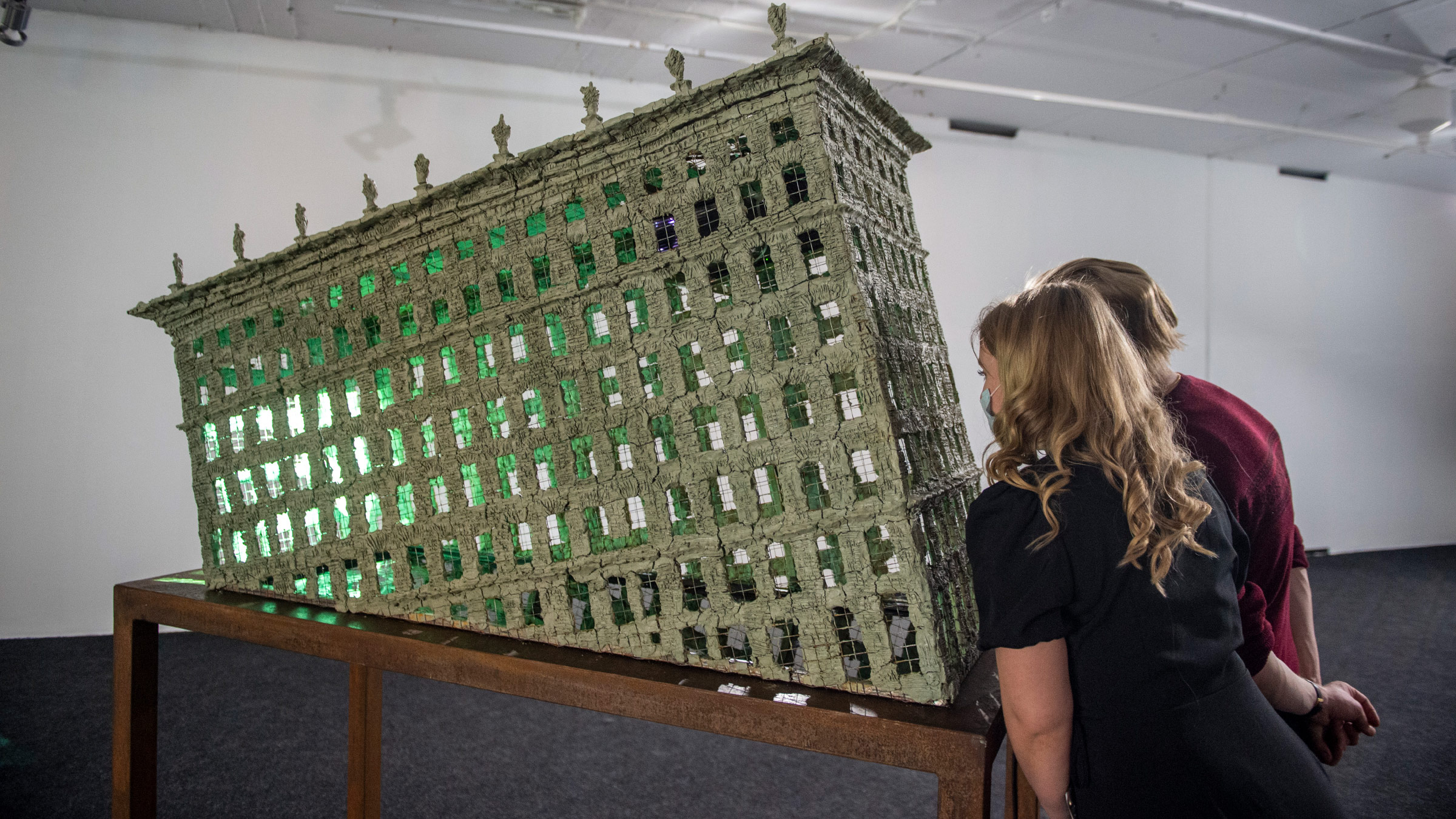 Если помещение, где выставлены «Окна», напоминает полузаброшенную фабрику изнутри, то внешний вид этой фабрики можно увидеть на примере трёх объектов из необожжённой глины, которые так и называются — «Фабрики». Одна из них ещё теплится — внутри горит огонь, раздаётся гул механизмов, трубы, широкие и высокие, как у «Титаника», извергают дым. Вторая фабрика ещё дымит, но огонь уже погас, а третья уже и не дымит. Все три фабрики — откровенно не новые и давно не ремонтированные здания брутальной архитектуры, где о красоте никто никогда не думал. Грустные, как старые бездомные собаки.