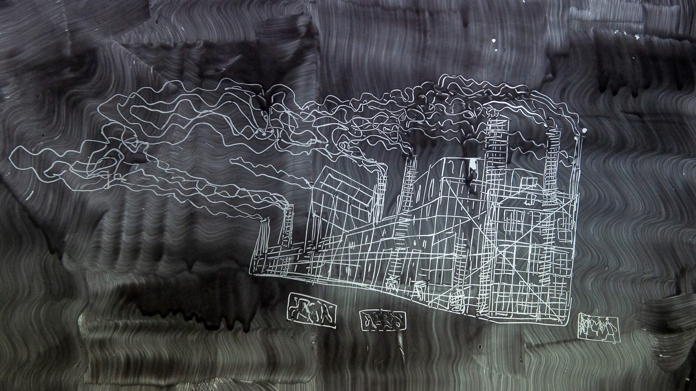Инсталляция «Окна и фабрики» занимает весь первый этаж музея. Это пространство выглядит непривычно пустым, серым и каким-то техническим. «Окна» расположены вдоль стен так, будто это настоящие окна, а помещение — это не музей, а заброшенная фабрика, где окна замазаны извёсткой, уже слегка запылившейся и приобретшей сероватый цвет, и кто-то уже проник в это запустение и разрисовал окна, как это бывает, пальцем по извёстке.