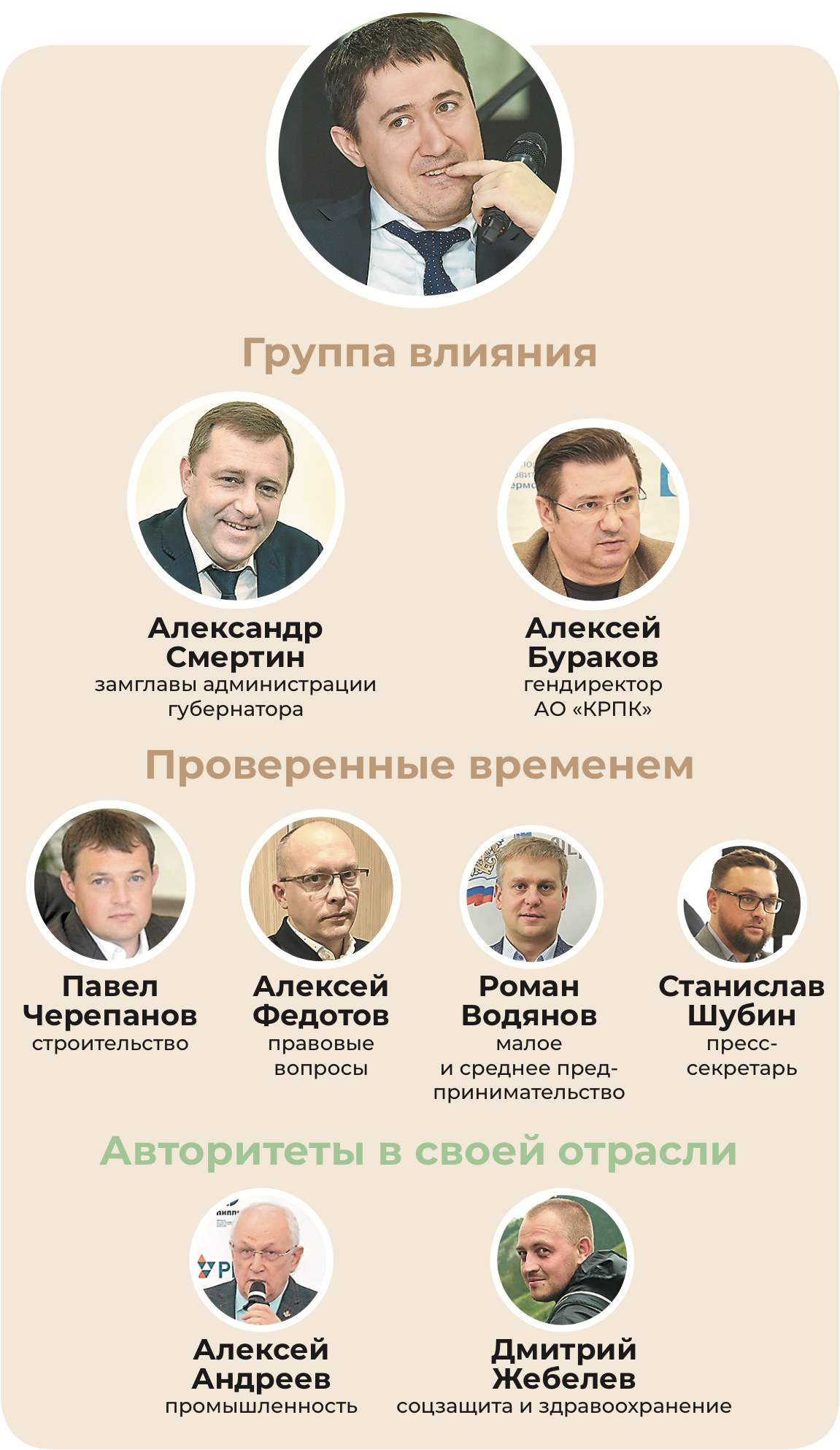 По данным разных источников, наиболее влиятельными людьми в окружении Дмитрия Махонина на сегодняшний день являются гендиректор АО «Корпорация развития Пермского края» Алексей Бураков и замглавы администрации губернатора Александр Смертин.