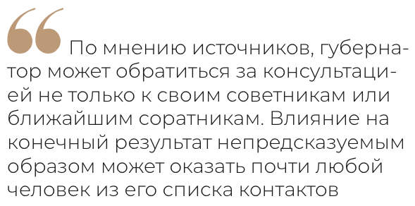 Вместе с тем подчеркнём, что, по мнению источников, губернатор может обратиться за консультацией не только к своим советникам или ближайшим соратникам. Случается, что позицию по тому или иному вопросу может сформировать коллега из ФАС или другие хорошо знакомые ему люди. Влияние на конечный результат непредсказуемым образом может оказать почти любой человек из его списка контактов.