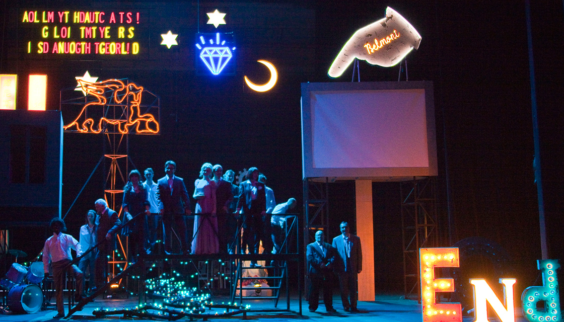 Разумеется, действие происходит вовсе не в эпоху Ренессанса, а в наши дни. Место действия — конечно, никакая не Венеция, и даже не Нью-Йорк, а какой-нибудь Нижний Ист-Сайд — комсополитичное предместье, где селятся разнонациональные иммигранты, и у них свои «тёрки» и «разборки». О Венеции тут напоминает лишь неоновый Лев Святого Марка, но это, скорее всего, вывеска какого-нибудь ресторана или казино. Тем более что кроме него на сцене имеется, например, lucky cat, равномерно машущая лапой «покемонистая» игрушка огромных размеров — гипертрофированный символ современной массовой культуры Дальнего Востока. В такой обстановке экзотические Марокканский принц и Шанхайский принц смотрятся просто как представители диаспор, и нет ничего удивительного, что они оказались в реалити-шоу «Выбор жениха для Порции». Перенос во времени сложился в определённую логику, которая не напрягает, не вызывает раздражения.