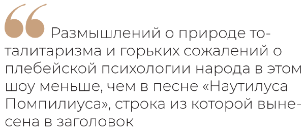 Действие спектакля очень напоминает танцкласс: бесконечные упражнения, временами интересные, порой даже сложные, с элементами акробатики, но — ничего больше. Размышлений о природе тоталитаризма и горьких сожалений о плебейской психологии народа в этом шоу меньше, чем в песне «Наутилуса Помпилиуса», строка из которой вынесена в заголовок.
