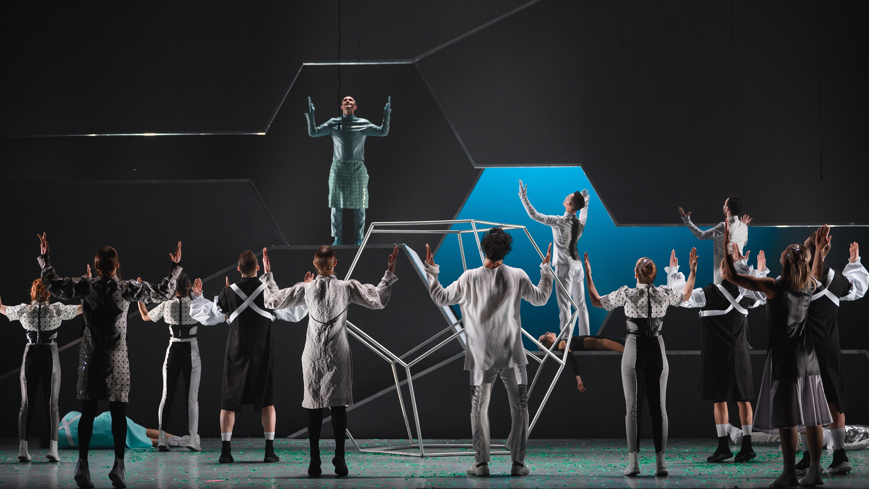 Стилистика спектакля — хай-тек (художник-сценограф Вера Никольская, костюмы Ирэны Белоусовой, свет Андрея Абрамова, видео Ильи Шушарова) — подходит как для футуристической драмы, так и для рейва. Минималистические изобразительные решения — никелированные металлические многоугольники, простая геометрия, кислотные цвета, но при этом технически сценография очень сложная, задействована вся навороченная машинерия реконструированного большого театрального зала; всё это так механически непросто, что в вечер премьеры что-то в декорации заклинило, и начало спектакля пришлось отложить минут на 40.