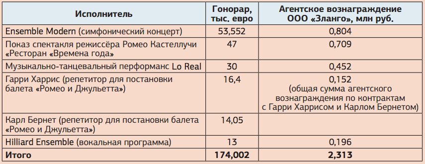 Некоторых затрат и усилий от агента потребует лишь оформление документов, необходимых для соблюдения российского трудового законодательства, сопровождение артистов из аэропорта в отель и обратно, а также предоставление двух переводчиков на время этих поездок. Наконец, во время репетиций и собственно выступления агент обеспечит оркестр кофе с печеньем. И всё это — всего лишь за 804 тыс. руб.