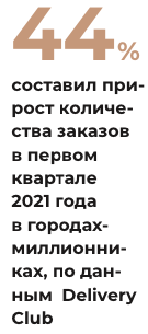 Согласно данным Delivery Club, в первом квартале 2021 года в городах-миллионниках прирост количества заказов составил 44%, в Москве — 50%, а города с населением меньше миллиона показали двукратное увеличение числа заказов.