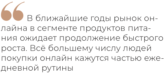 Участники рынка и эксперты говорят, что в ближайшие годы рынок онлайна в сегменте продуктов питания ожидает продолжение быстрого роста. Именно в этом сегменте происходит изменение поведения потребителей. Всё большему числу людей покупки онлайн кажутся частью ежедневной рутины.