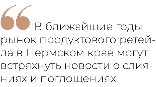 Кроме того, в ближайшие годы рынок продуктового ретейла в Пермском крае могут встряхнуть также новости о слияниях и поглощениях. «Для федеральных ретейлеров сейчас характерна стратегия поглощения региональных игроков, совсем недавно стало известно о покупке «Дикси» (покупает «Магнит». — Ред.) и Billa (покупает «Лента». — Ред.), — отмечает Елена Гилязова. — Нечто подобное может произойти и с региональными сетями в Пермском крае. И, скорее всего, в качестве покупателей выступят крупные федеральные сети. За последнее время ГК«ЭКС» продала два крупных актива в Перми с существенным снижением первоначально заявленной цены. Если так пойдёт и дальше, это ускорит продажу и других активов торговой сети».