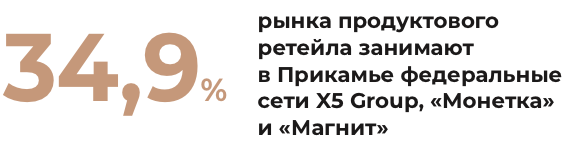 Торговые сети «Пятёрочка», «Перекрёсток» и «Карусель» (X5 Group) по итогам 2020 года занимают 16,6% (по итогам 2019 года — 13,74%). Торговая сеть «Магнит» увеличила своё присутствие в регионе за год с 11,57 до 13,3%, а «Монетка» — с 4,05 до 5%.