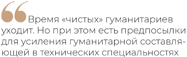 Что касается тенденций на рынке образования, то у доцента НИУ ВШЭ Дмитрия Гергерта складывается впечатление, что время «чистых» гуманитариев уходит. Но при этом есть предпосылки для усиления гуманитарной составляющей в технических специальностях. Например, экологичность, безопасность, влияние на личность и психику пользователя. «Уже давно наблюдается тенденция роста роли IT-компонента и матметодов даже в таких сферах, где это не ожидалось ранее», — говорит эксперт. Сейчас востребованы специальности «на стыке профессии и математики с IT».