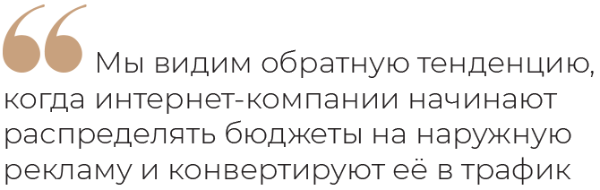 В моменты любого кризиса компании всегда сокращают расходы на рекламу, маркетинг и персонал, рассказывает представитель Гильдии маркетологов России в Пермском крае, амбассадор АКАР Денис Пестов. Отличие 2020 года заключается ещё и в том, что сейчас владельцы бизнеса хотят большей прозрачности и реклама уходит в интернет. «По количеству кликов в интернете они видят эффективность рекламы, а по касаниям «наружки» — нет, есть только некие аморфные исследования, — рассказывает Пестов. — Для некоторых видов бизнеса, в первую очередь публичных, с большим количеством точек продаж, офлайн необходим. Это нужно для поддержания связи с потребителем. Но это один из самых непрозрачных видов рекламы и при этом самый затратный».