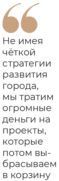 Не имея чёткой стратегии развития города, мы тратим огромные деньги на проекты, которые потом выбрасываем в корзину. Бесконечные обсуждения. Взять тот же зоопарк: сколько этих проектов было? И никакой ответственности.