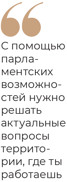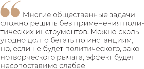 — Очень многие из тех задач, о которых я говорил, сложно решить без применения политических инструментов. Можно сколь угодно долго бегать по инстанциям, но, если не будет политического, законотворческого рычага, эффект будет несопоставимо слабее. К тому же статус депутата помогает многие вопросы решать в Москве, выходить с законотворческими инициативами на уровень Госдумы.