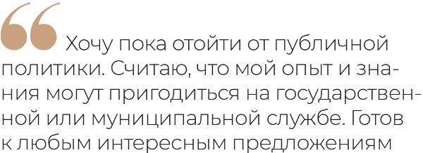 — Хочу пока отойти от публичной политики. Считаю, что мой опыт и знания могут пригодиться на государственной или муниципальной службе. Готов к любым интересным предложениям. Если же таких предложений не поступит, видимо, вернусь в сферу информационных технологий, которой занимался большую часть своей рабочей биографии.