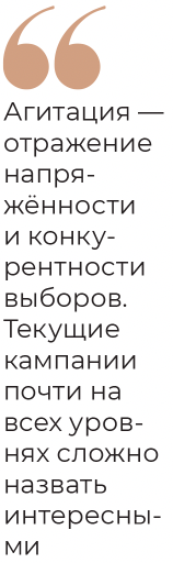 Агитация — отражение напряжённости и конкурентности выборов, говорят эксперты. «Текущие кампании почти на всех уровнях сложно назвать интересными, — говорит политолог Всеволод Бедерсон. — Агитация соответствующая: вряд ли она реально призвана бороться за отдельные группы избирателей. Это стандартный набор форм, в том числе по темам». Кроме того, партии власти и «административным» кандидатам важно, чтобы явка была меньше. Поэтому в ярких АПМ нет никакой необходимости. В качестве исключения он отмечает кандидата по округу №2 в заксобрание Ирека Хазиева, который интересно обыграл тему с партийными медведями на плакатах.