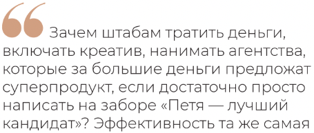 В целом, по словам Рябухина, пока агитация в интернете работает на узнаваемость (не на рейтинг), и это определяет форматы — крупным планом лицо кандидата и какой-то призыв. «Креативных решений в прямой агитационной работе не так много, — говорит он. — Да, стало больше видео, причём снятого не с одного, а с двух ракурсов. Плюс научились делать монтаж. Стали использовать анимационные материалы. Но в целом всё достаточно традиционно: «взяли» лицо — и вперёд. Даже КПРФ идёт по этому же пути: лицо — слоган».