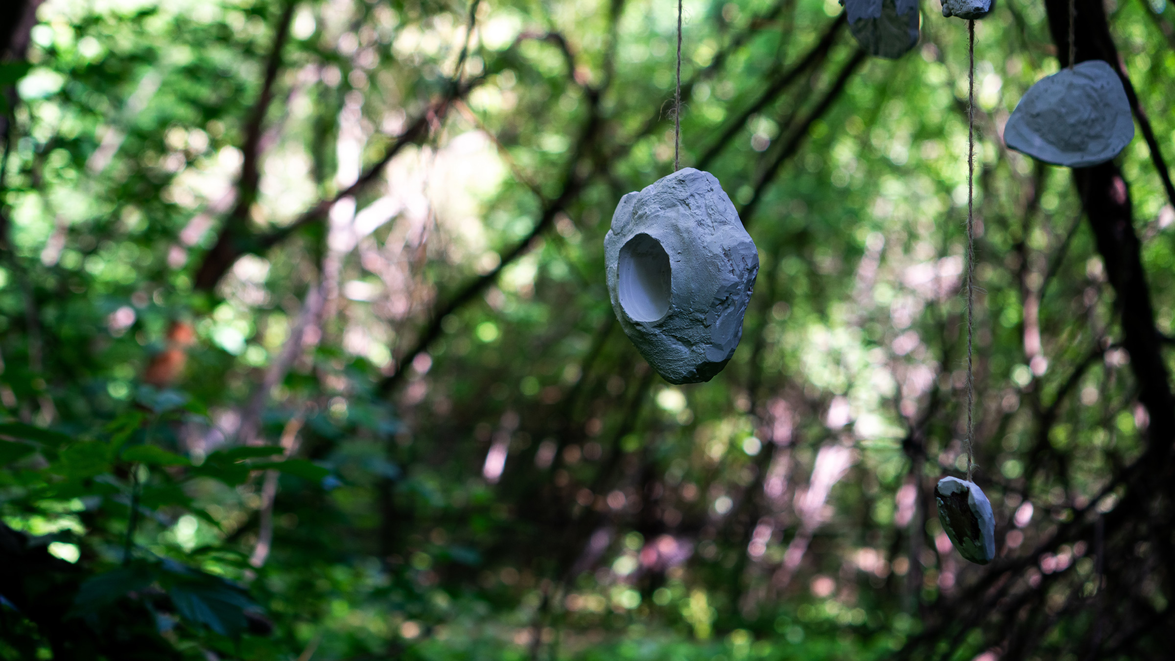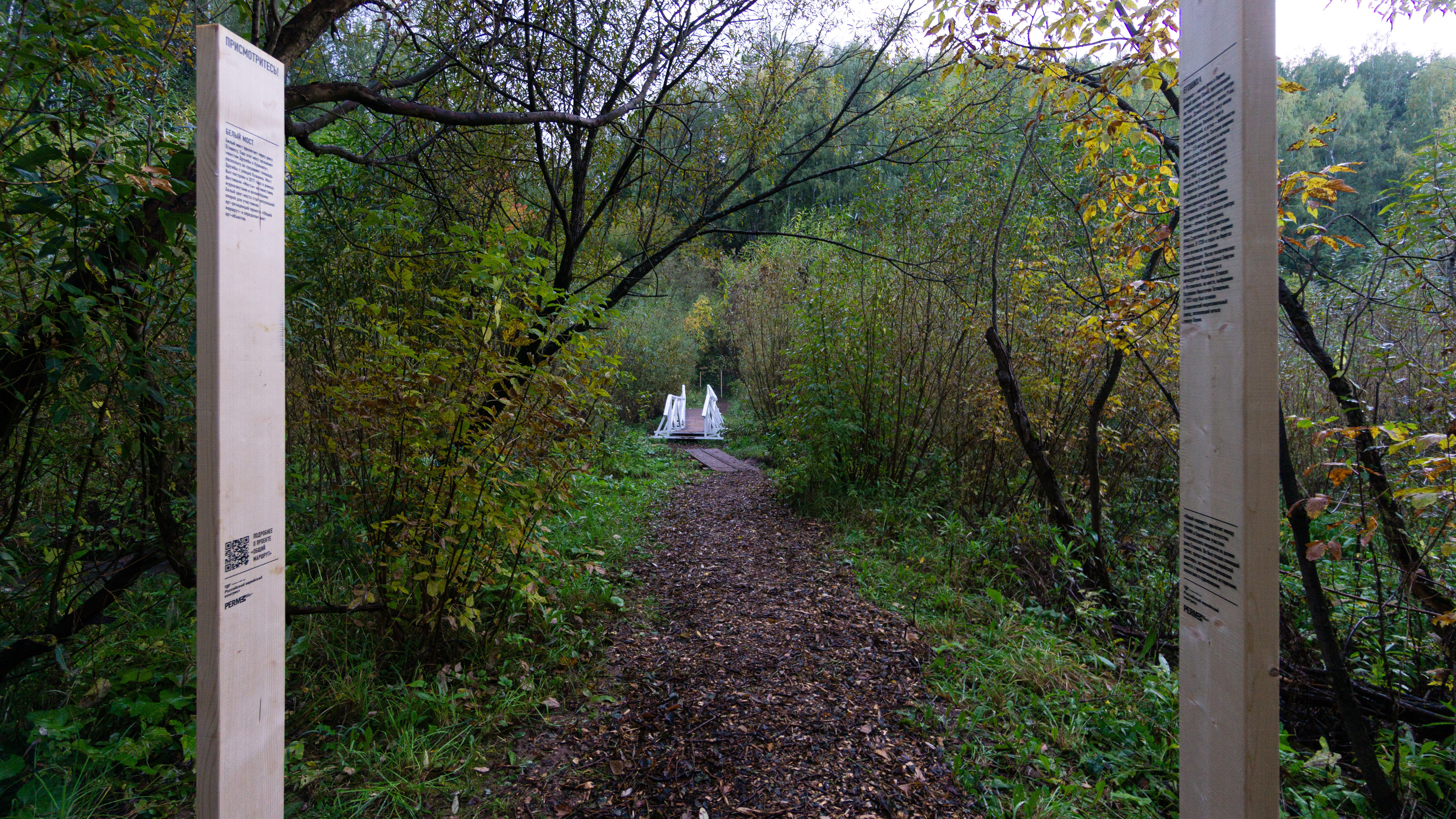 На протяжении всего маршрута пешеходов сопровождают слепки рук и лиц — результаты работы арт-резиденции под руководством Маяны Насибулловой. Безмолвные лица, глядящие со стволов берёз и почти сливающиеся с ними, говорят о необходимости быть незаметным, попытаться слиться с природой и помнить, что входишь в чужое пространство, где много «коренных жителей» — животных и птиц. Громкое кряканье обитателей Егошихи это подтверждает.