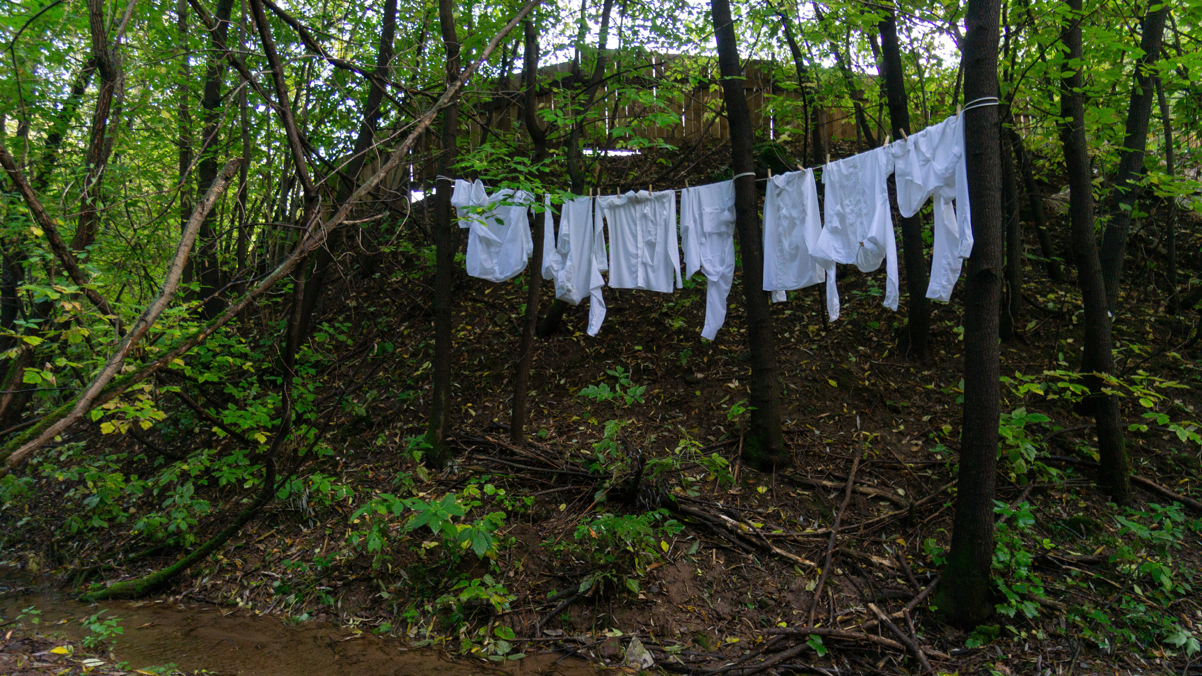 Среди деревьев прячется верёвка с развешенными на ней белыми одеждами — это инсталляция Ольги Школиной, часть её проекта «Забытые вещи». Бельё не верёвке — знак того, что когда-то этот лог был обитаем, и напоминание об иудейской траурной традиции разрывания одежд, что запечатлено во второй части проекта — видео, которое можно посмотреть в экспозиции в музее. Руководитель резиденции и куратор выставки Александр Агафонов считает этот проект очень чувственным и трогательным.