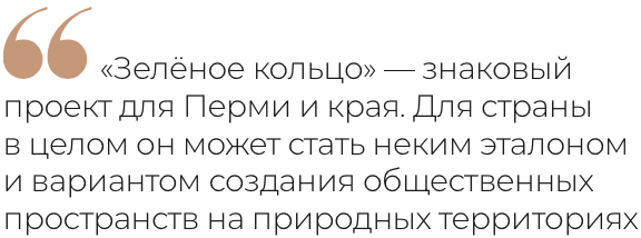 «Зелёное кольцо» — знаковый проект для Перми и края. И для страны в целом он может стать неким эталоном и вариантом создания общественных пространств на природных территориях. Думаю, что Пермь может очень серьёзно заявить о себе», — сообщил Дмитрий Андреев.